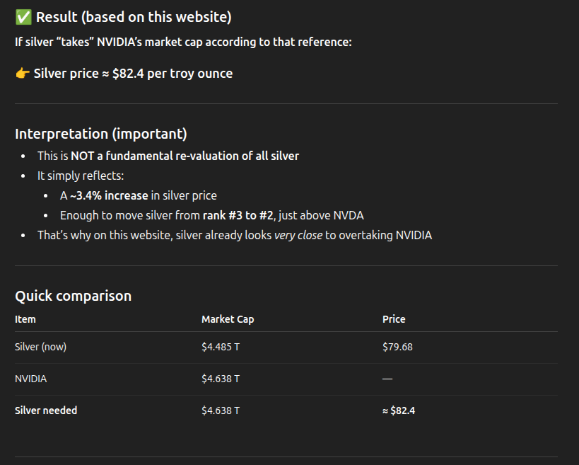 >>61549706If silver “takes” NVIDIA’s market cap according to that reference:Silver price ≈ $82.4 per troy ounceScreencap this post. Prepare your short.Silvercuck will get rekt.