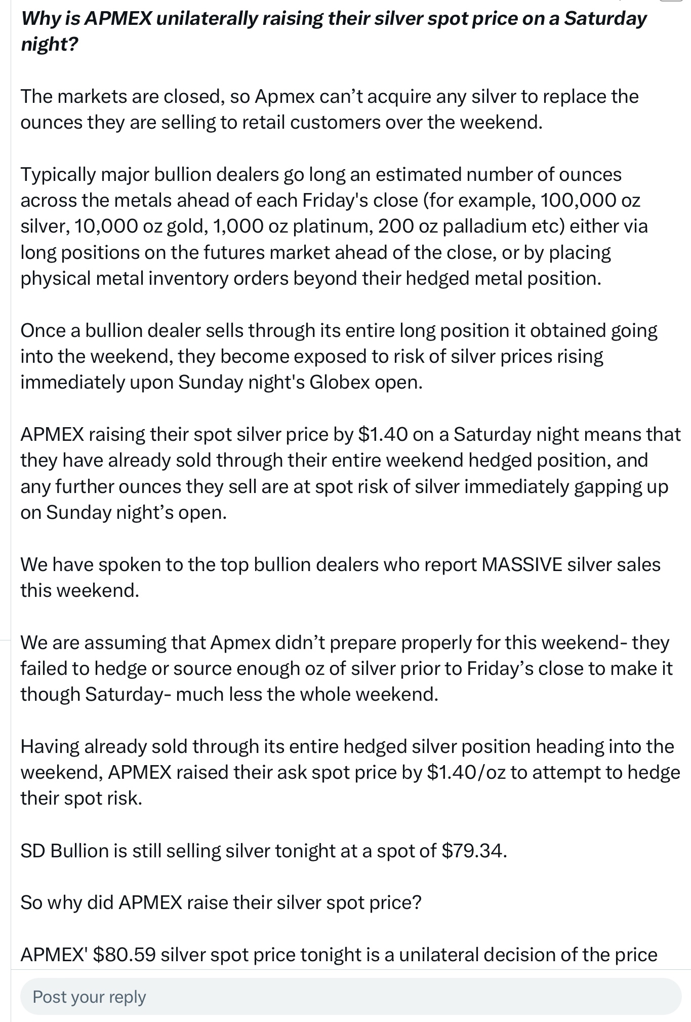People losing their shit about 9am thin volume trading in China. This is a bit silly. Let’s see what the week holds for silver. Hours mean nothing. It’s volatile (though less so as the depth grows).