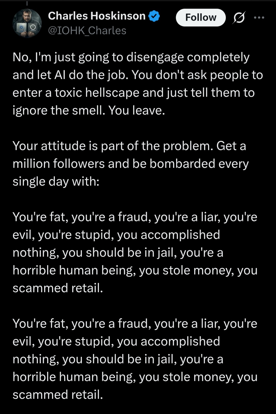 I'm only disappointed that he's leaving because he actually deserves to be shittalked at every microsecond of the day. And even then that's hardly enough penance for how damaging that fat fucking retard scammer has been to crypto.