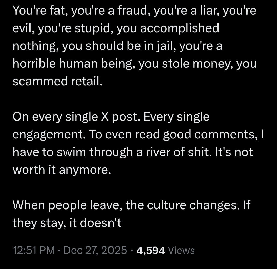 >>61554154I believe it's a mixture of this and also he wants a hug box where he can just ban everyone that calls him out. I think we will get bored talking to his own bots and will be back on X within a few months, or as soon as the market as a whole starts to turn around. The guy is obsessed with how others see him lol.There was a recent comment on one of his posts that called him "the Craig Wright of ethereum" and I think that was the one that made him snap