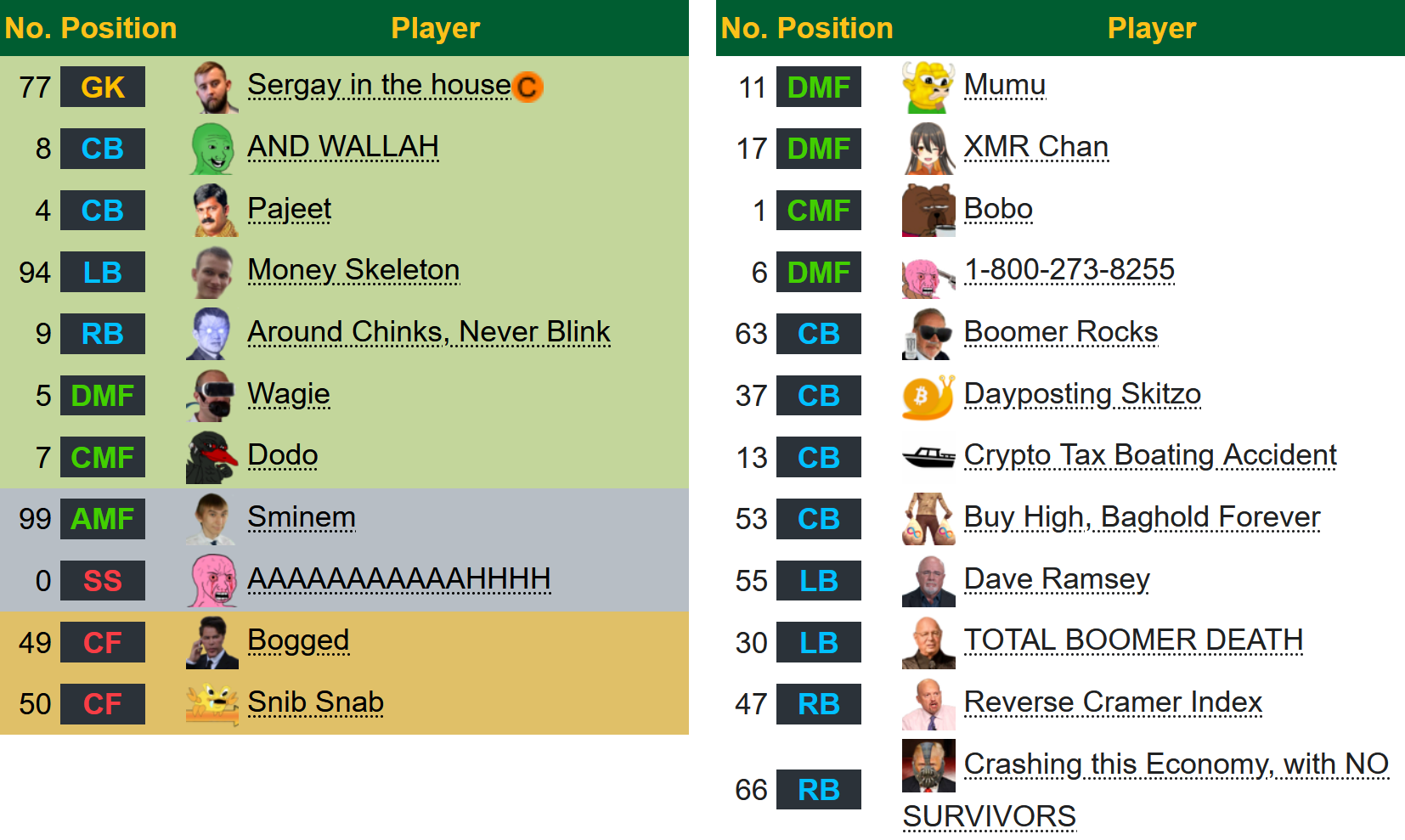 >What is 4chan Cup?4chan Cup is a virtual Association Football tournament, played with AI vs AI on Professional Evolution Soccer by Konami, featuring teams made up of various 4chan boards playing against each other.>When does /biz/ play?/biz/ doesn't play today, but we do need to prepare for the Elites in Winter, which are the higher tier of competition in this tournament. The kickoff is in a few weeks.We'd like to hear feedback on the roster, and if there are any changes you'd like to see. Suggestions will be polled as soon as possible. One thing that may need to be revised is the Boomer Rocks, which over the course of the past few months have turned into Boomer Rockets to the moon.>More Info on the current tournament?>https://implyingrigged.info/wiki/2026_4chan_Winter_Cup