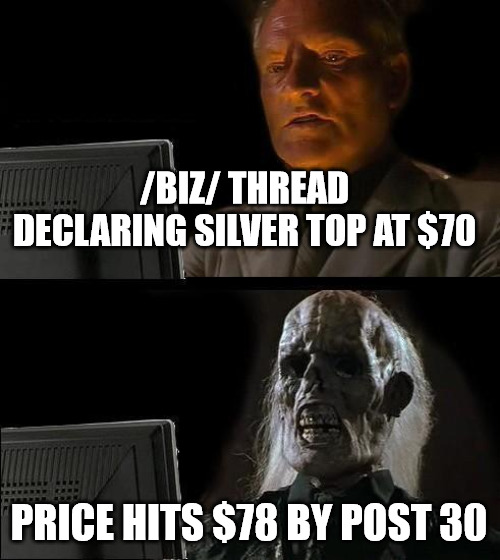 >>61557487>silver flat lines>"it's a value storage, it's supposed to do that">silver pumps>"it has industrial uses, it's supposed to do that">silver dumps again>"it's a value storage, you weren't supposed to buy it for gains"if you want a SHTF insurance, store alcohol, cigarettes and ammo