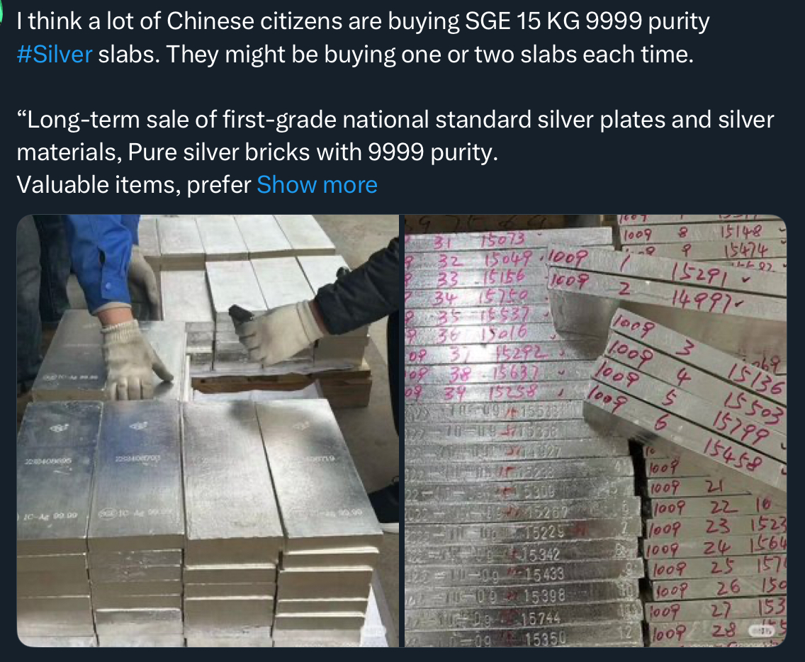 >>61560926>When China restricts silver exports on Jan 1, you won’t be able to buy silver anymore, and the price will skyrocket.>But you already knew that, didn’t you, Jew.Correct. There's not enough silver for all industrial manufacturing. Silver is in every car and every gadget (every circuit board) .