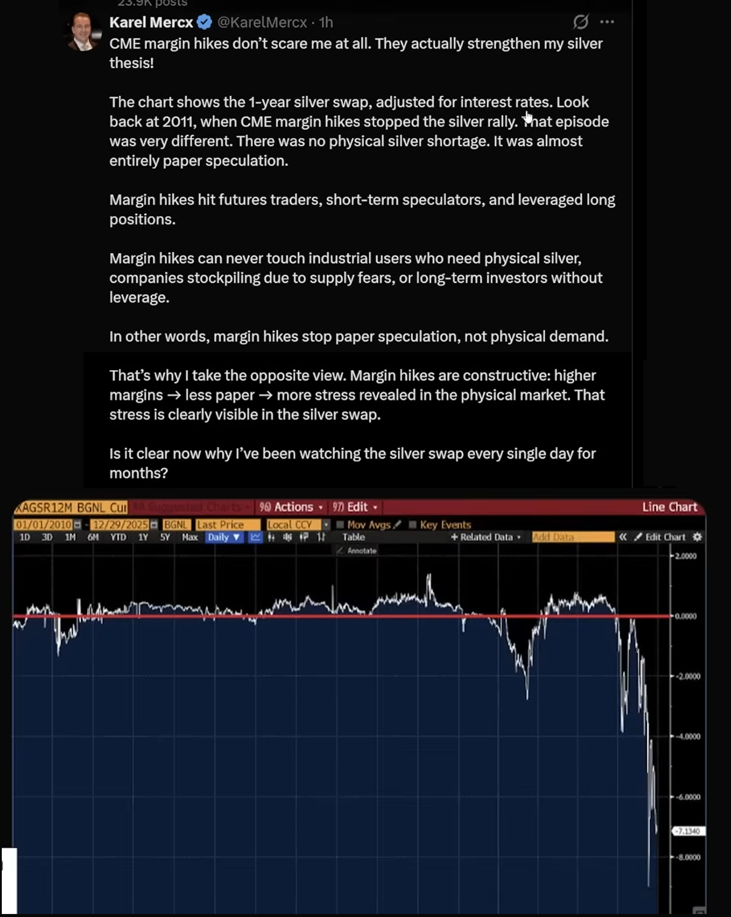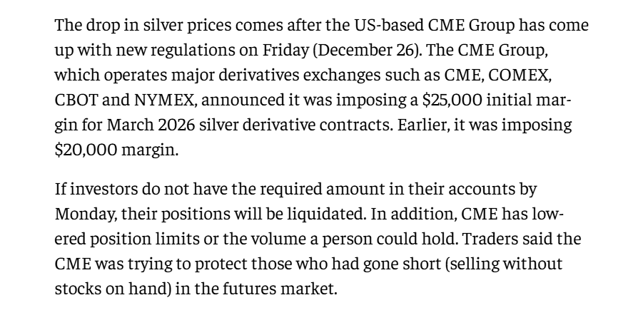 >>61564740>The only DD you need to know is buy silver.we live in unprecedented times for the silver market, we got years of crabbing to be lazy, but rn it's important to figure out what is going on.How many here are aware the CME group raised once again the marging requirements on 29th of dec. and lowered positions limits to kill all longs right at the opening? That was the weapon used to trigger the $10 dip.If a newb stacker bought during the weekend and look at the chart, then google news only to be served the mainstream slop narrative claiming everybody was cashing out on monday and the top was in, you need to be able to explain to him Tampowitz tricks are desperate attempts at winning the optics by bending his own rules.