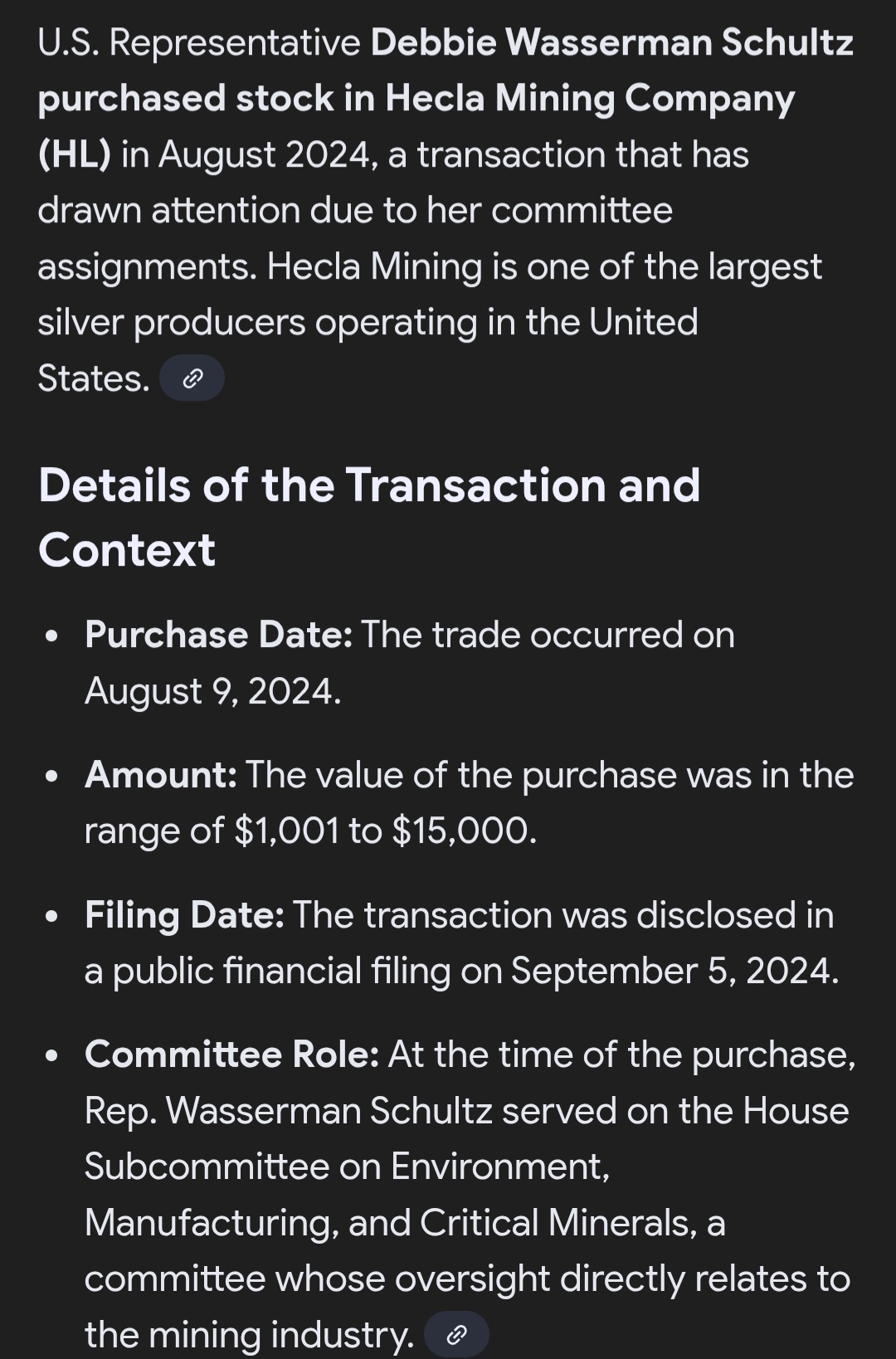>>61564770>Debbie Wasserman Shultz purchased stock in a mining company>At the time of purchase, Rep. Wasserman Schultz served on the house subcommittee on Environment, Manufacturing, and Critical Minerals, a committee whose oversight directly relates to the mining industry Why is this legal?