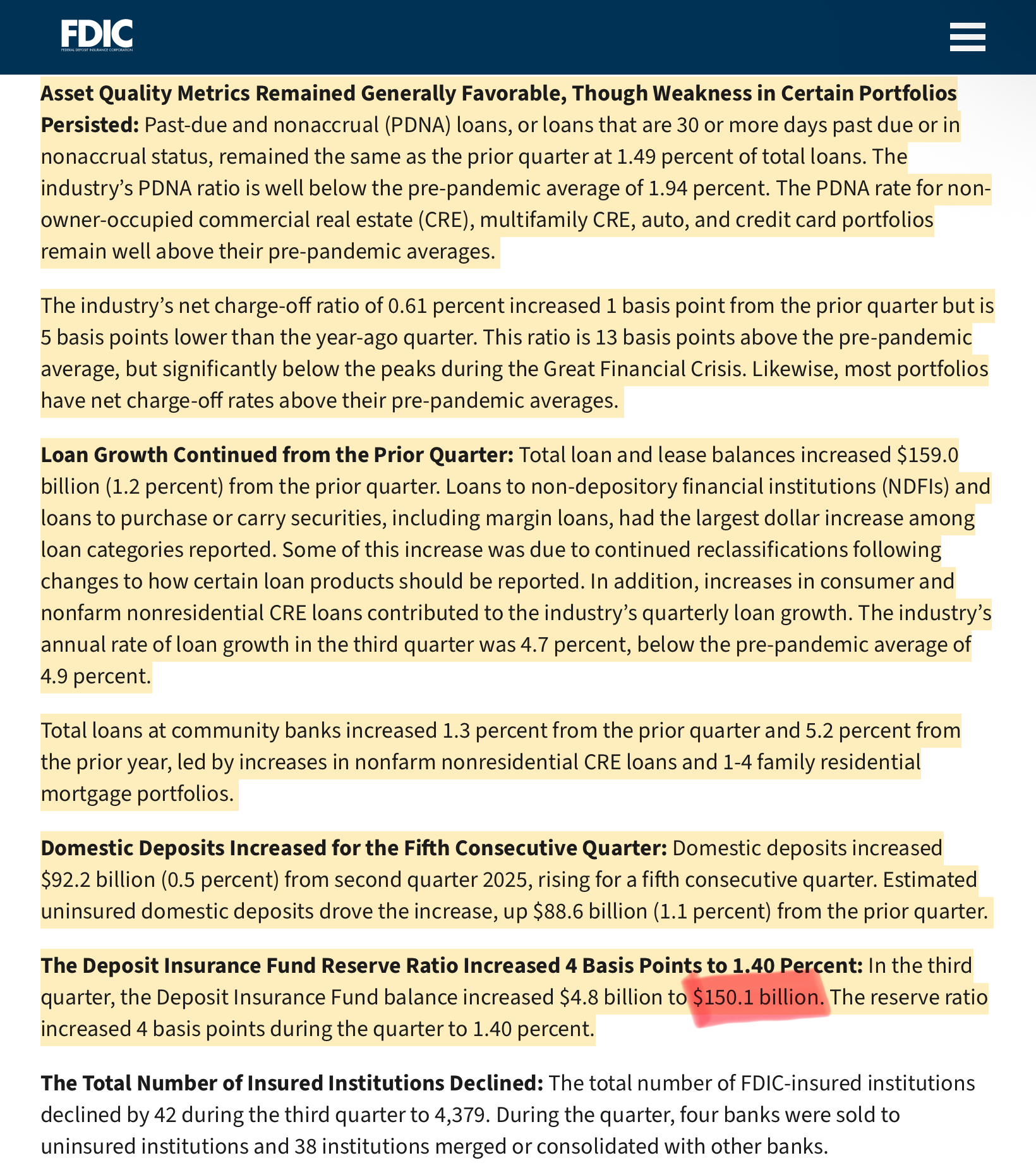 >if anything actually bad happens you’ll be lucky if you get maybe $400 (FOUR HUNDRED DOLLARS)https://www.fdic.gov/news/press-releases/2025/fdic-insured-institutions-reported-return-assets-127-percent-and-net#:~:text=The%20Deposit%20Insurance%20Fund%20Reserve,the%20quarter%20to%201.40%20percent.