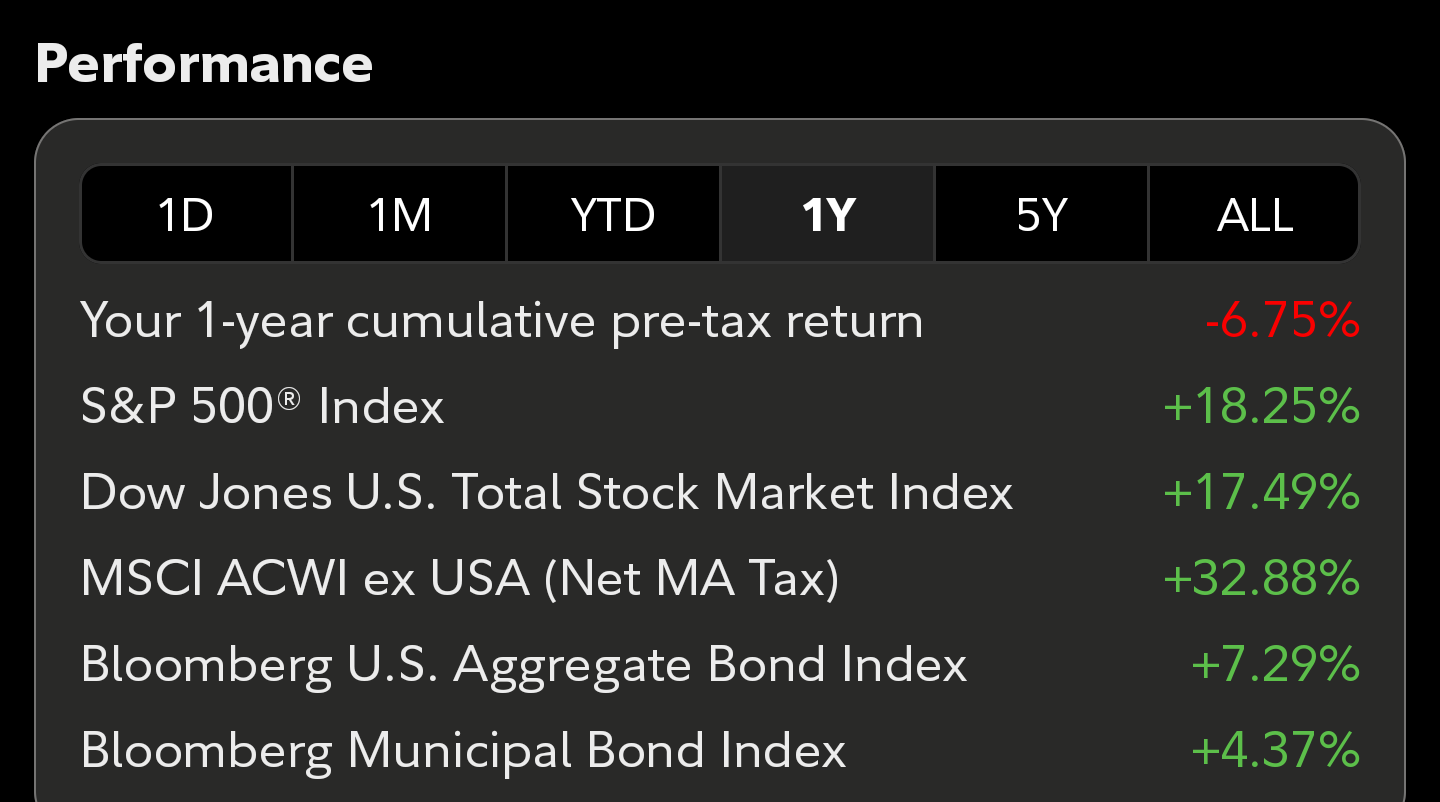 >>61572895I can't believe you didn't ask about 2025>>61572901Today: 0.00%Week: 0.28%2025: -15.30%I learned a lot this year and switched almost entirely to index funds after mucking it up. I wish I'd done it sooner instead of slowly averaging into it throughout 2H 2025, but it is what it is.