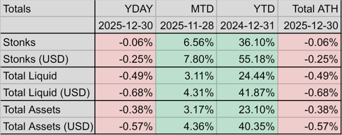>>61572895-2.01While not down hugely, all but one holding was red today, including etfs and coins. Solid year that ran out of gas in Q4. I guess 2026 is "put up or shut up" time for the AI trade.On the plus side, I feel I'm done with positioning for 2026 as far as US stocks go. May finally start looking into some Asia companies like I've always wanted.>>61572900Holy smokes, congrats anon. When are you starting a hedge fund?