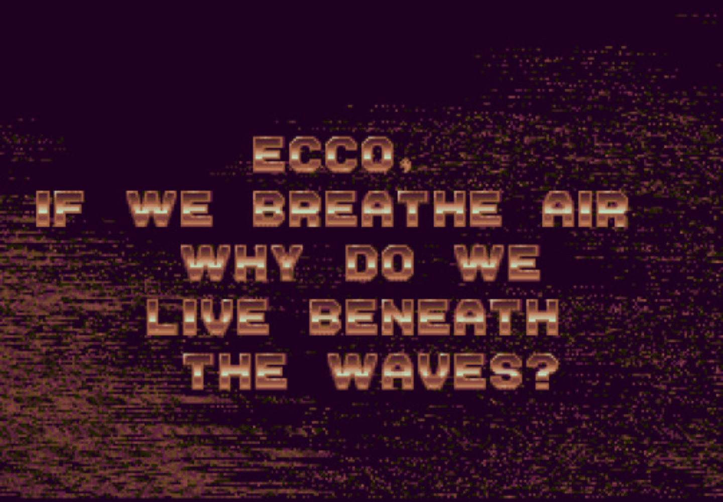 i will tell u guys a story since the numbers are not moving today. nobody knows this about me, not even my mom. when i was a small i founded a game from real arcade. i thought it was a fun game. its called ecco the dolphin. after swimming around u can talk to the other dolphins. one of them says this. i couldnted read very well at the time but i remember getting goosebumps. anyway its a hard game so i couldn't get very far before the time ran out. about a year later i ended up playing it again, and again this quote. this time i understood it. this line from the dolphin game induced a profounded ego death that i can't get over to this day. ever since this thought was put into my head i have never been able to trust a single other person, i have never felt secure or comfortable. i can't be optimistic or have convection in anything. It released the negativity in my brain. Maybe I always felt that most things in the world around me didn't make sense, or maybe I have some childhood memory that I can't remember. it made me deeply cynical.