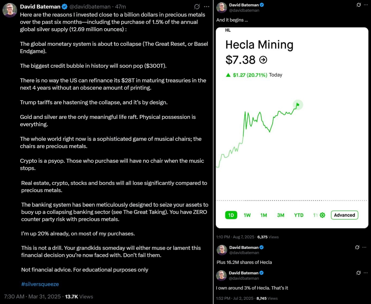 >>61600168>>61600195Based. I noticed their earnings were coming up next month as well. I'll place a fat market order tomorrow in my 401(k) account. Should I even fw any of the ETFs? Seems like Hecla is the clear leader BTFOing all the others (who are doing fantastic in theor own right).