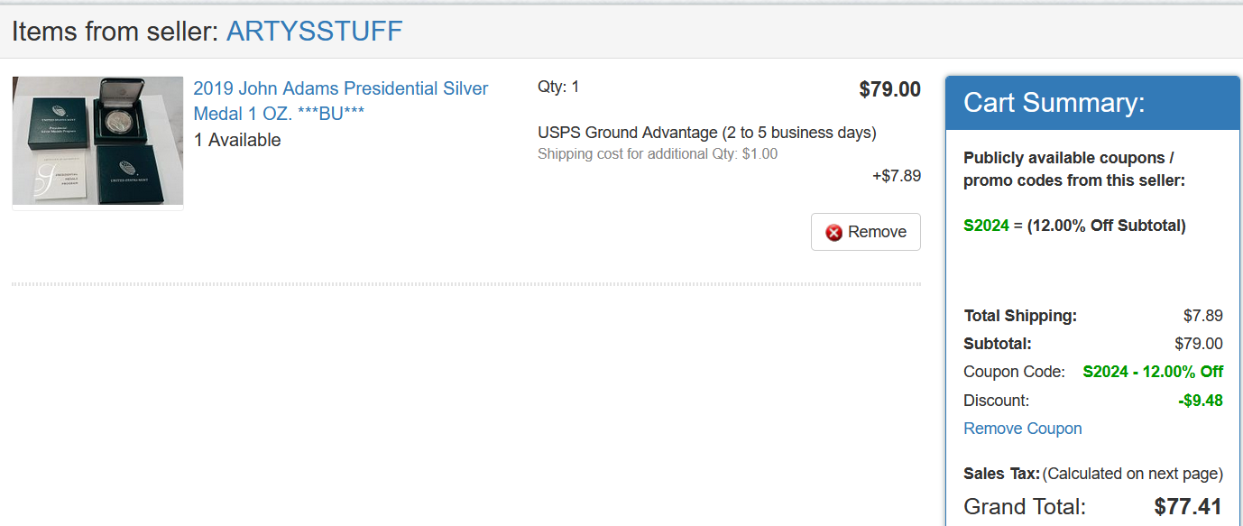 Here's a john adams presidential medal for 77 dollars if anyone wants to snag it on usacoinbookshttps://www.usacoinbook.com/item/2019-john-adams-presidential-silver-medal-1-oz-bu-943554/