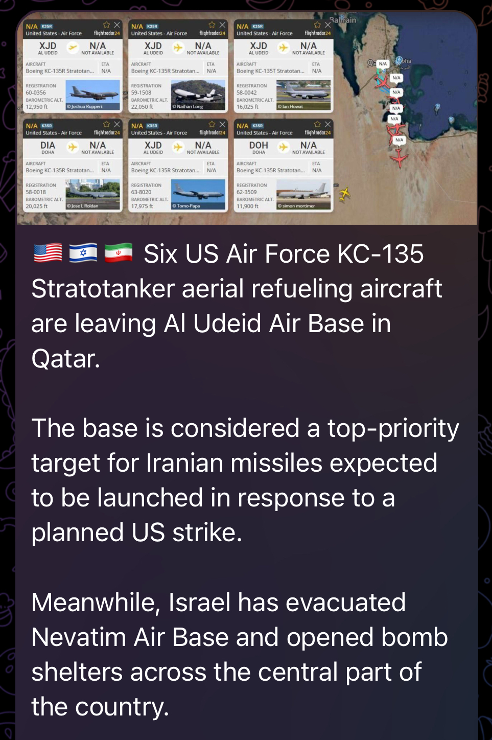 >BREAKING: The US military appears to be relocating several military refueling aircraft out of its base in Qatar