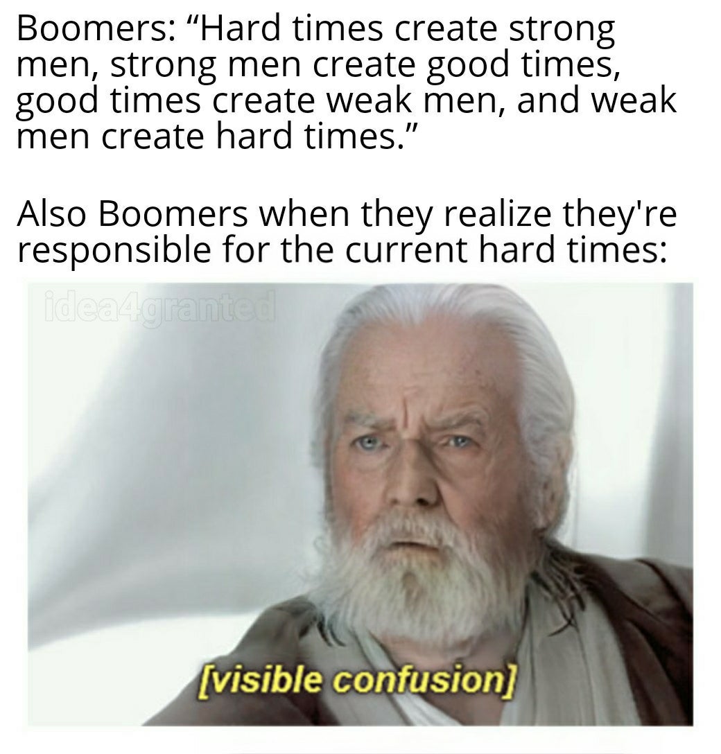 Anyone who slams younger generations is a piece of shit. I'm almost a boomer, and I grew up in all white neighborhoods, with safe streets and "firm handshake" jobs. I worked in IT before jeets replaced everyone. I saw how good it was for the boomers and even had a nice taste of the good life myself.