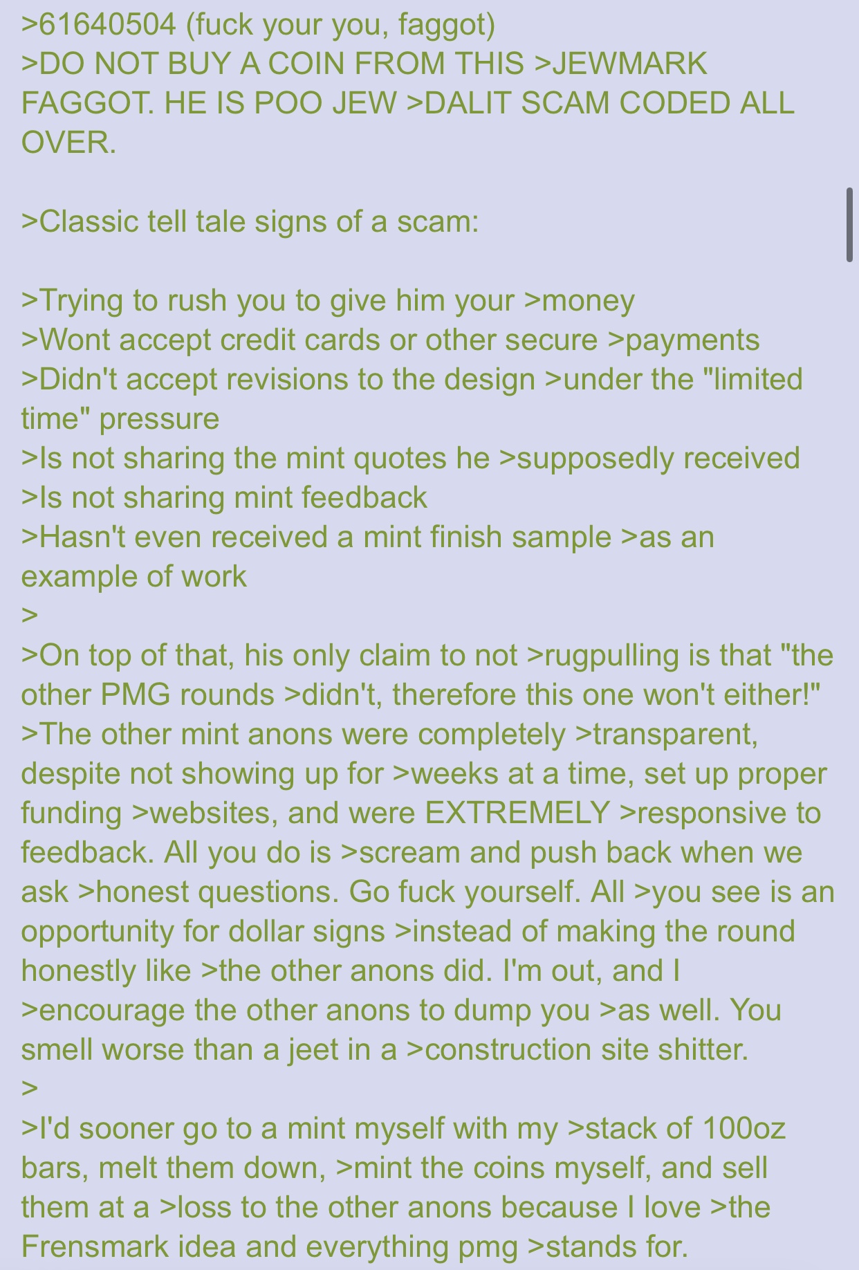 >>61643609>Ditch that gay ass political shit. that was the point of my post. I probably didnt word it well enough, but the nazi larp shit is outdated and putting it on this years pmg coin is stupid. Many of the previous pmg coins didnt have heavy politcal themes to them. Id like to see a coin that celebrates last years gains in a 4chan style that doesnt default to low hanging fruit racism
