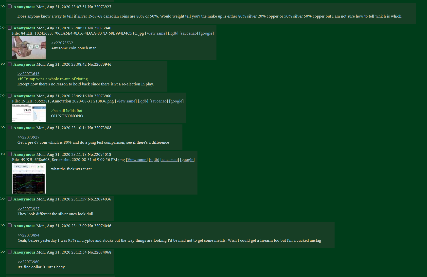 >>61643566>Anyone else buying more than they would usually?Couldn't be me. I feel nauseous buying at these prices. Even when i secure fantastic deals i'm seething to no end.Secured a lot of random silver coins from 1850-1950 for 80€ earlier today. Spot value : 200€. 60% below spot. You could imagine me being very happy right? I was fucking MAD sad, i almost asked for a cancel because i never before purchased junk at $37/oz.