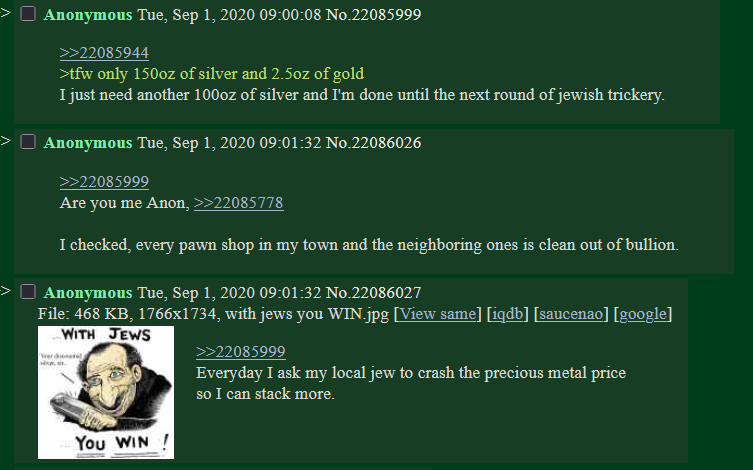 >>61643943>It's like they WANT us to be cleaned out of silver. Arrest these multinational cosmopolitan bankers and hang them highIt's like they do not want white people to have physical silver and they want to have it drained ASAP before all the normies have even one ounce of it.