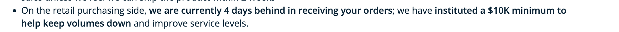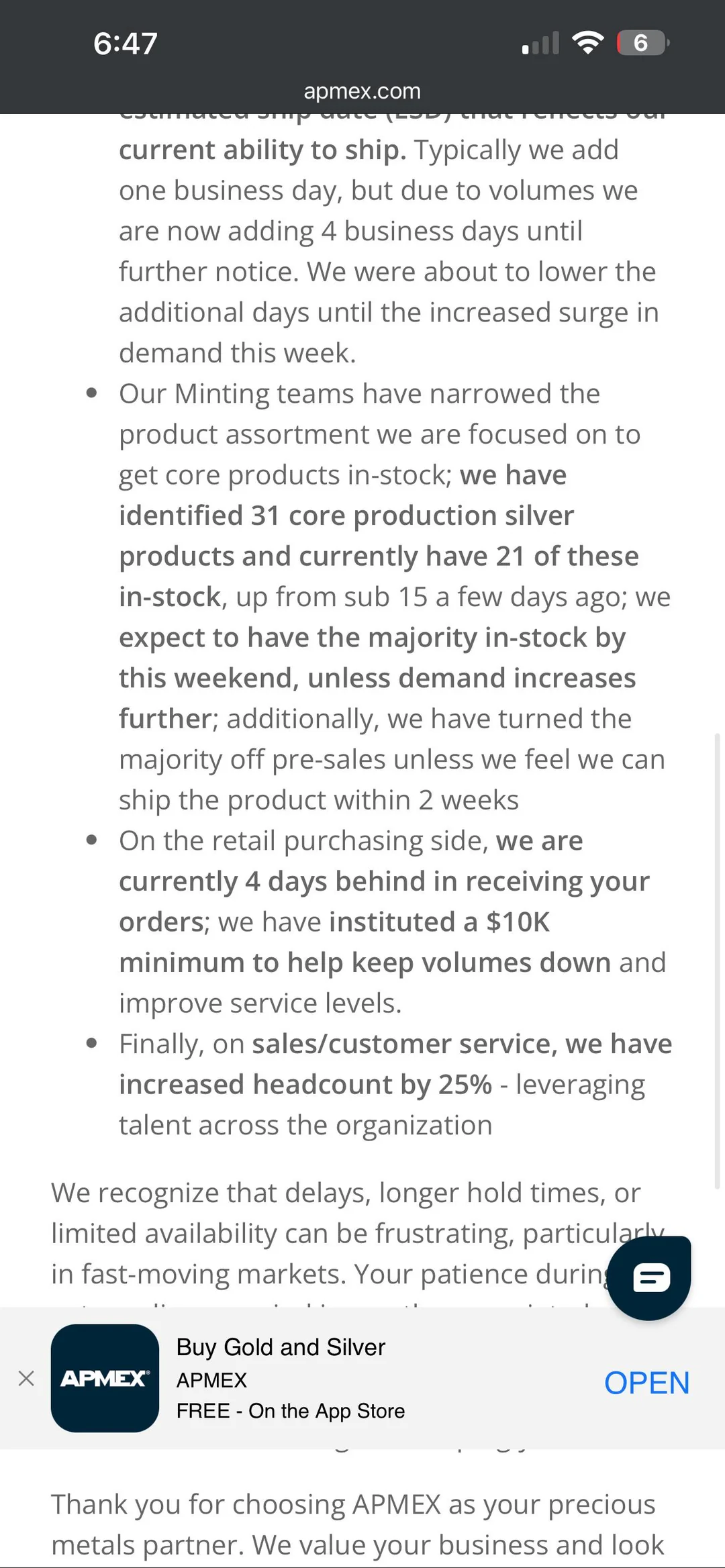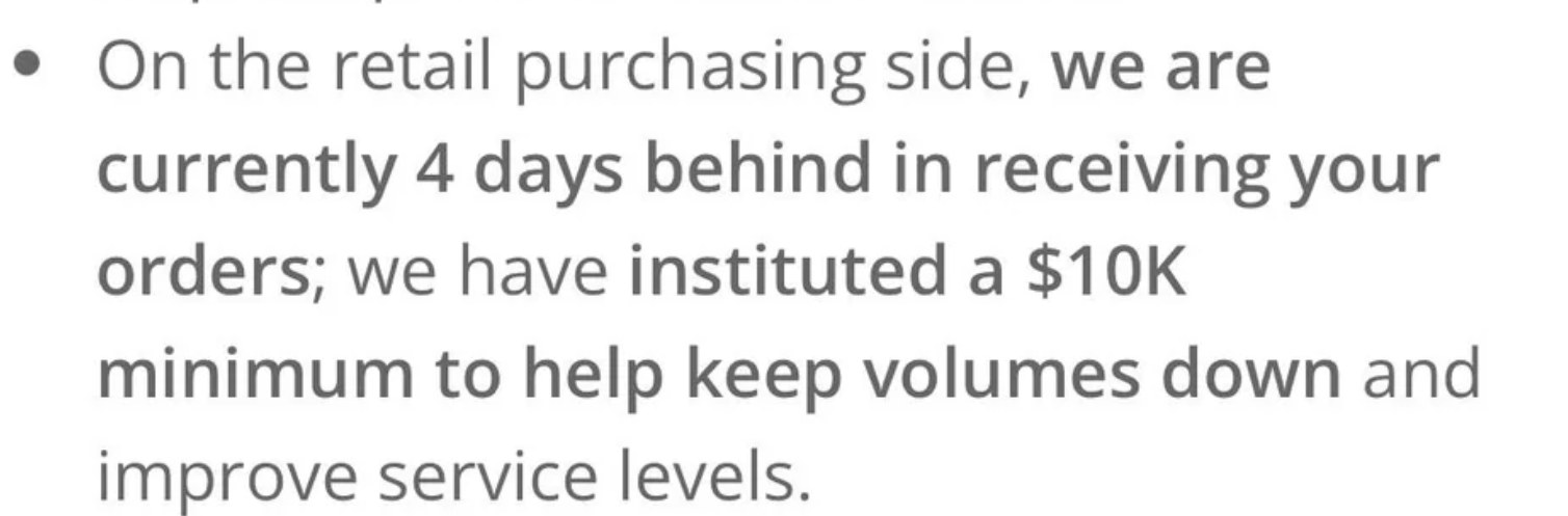 >>61644380>On the retail purchasing side, we are currently 4 days behind in receiving your orders; we have instituted a $10K minimum to help keep volumes down and improve service levels.their wordshttps://www.apmex.com/letter-from-the-ceo