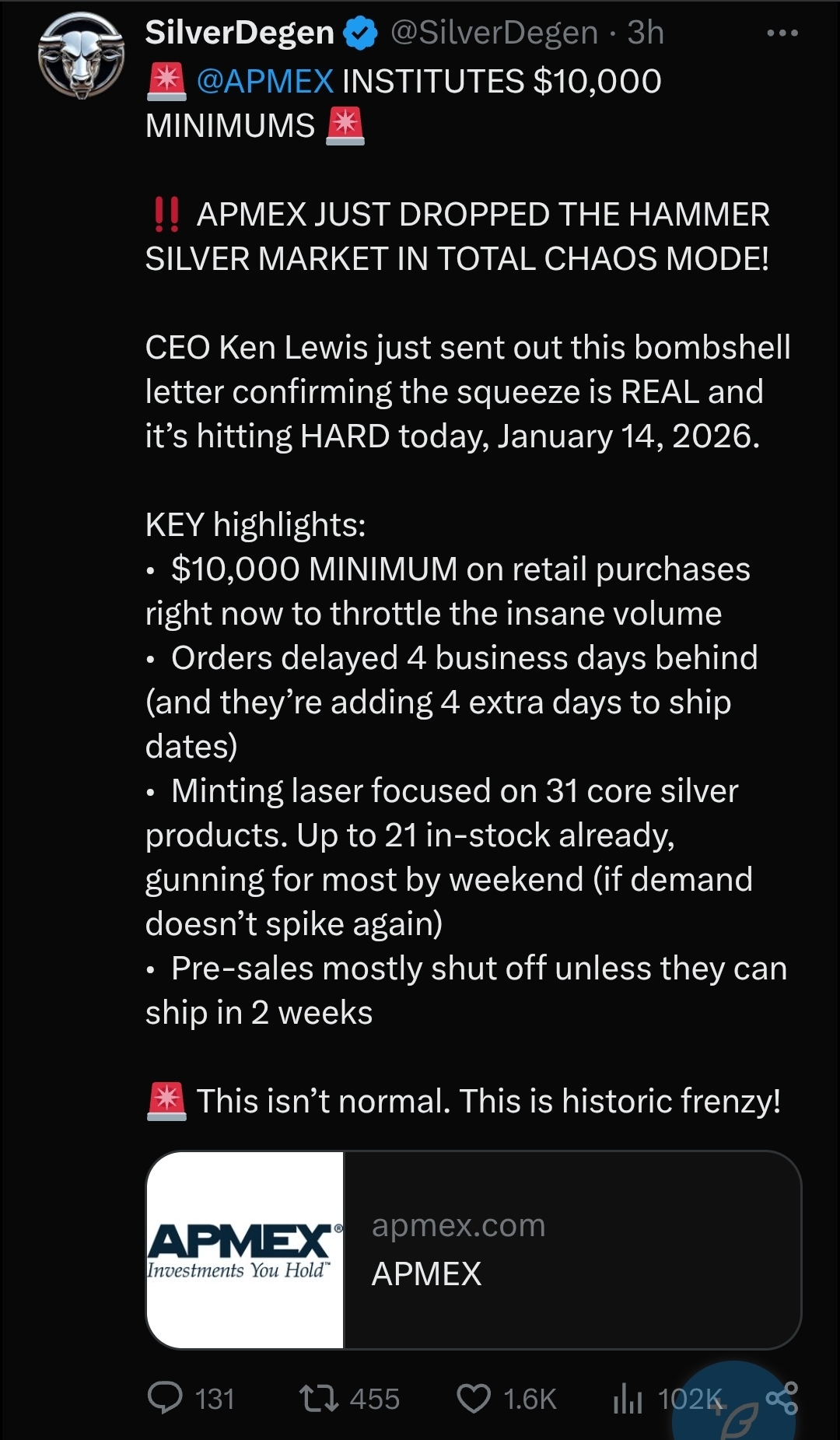 >APMEX ENDS ALL SALES UNDER $10,000https://www.apmex.com/letter-from-the-ceo