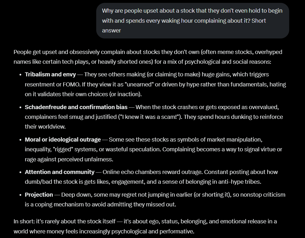 >>61647795With the turnaround complete, the quarterly statements green, $9BN on the balance sheet, we're probably just months away from M&A that is going to blow the stock sky high. I don't even really think it makes sense to be focusing on the 2021 squeeze being 5 years ago. Because we've only had $9BN on the balance sheet for less than a year. All of the squeeze conditions still exist and the GME valuation is 1:1 with its cash. It is a risk-free place to park your money when the markets are overbought and ripe for a selloff (likely caused by a GME short squeeze). There is no point in investing elsewhere and feeling like you are missing out on basis points when the market can easily collapse 80% and GME can effortlessly 10x. I'm content to hold GME because there really isn't a bear case at all. Look at when the shills post about. What, it's taking too long? Who cares. It's an axiomatic fact that these systemic issues in the financial system impact the masses. You have to find the imbalanced trades which are undervalued ahead of time to make the real money in the markets. GME is exactly that investment. It's all you need. You don't need index funds, you don't need a 401k, you don't need insurance. GME will set you free.