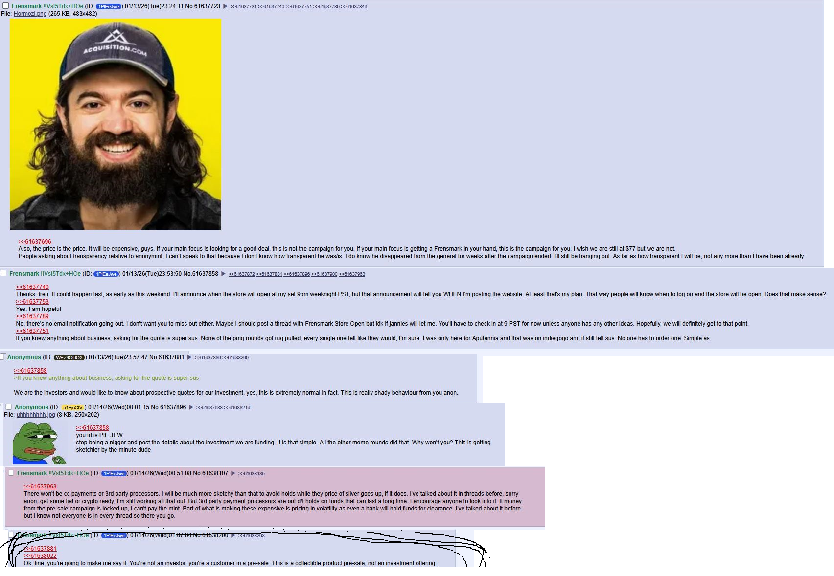 >"Consider past pmg meme rounds and ratios of price over spot then add into consideration my jewish needs. Muh market volatility premium, muh premium premium and its simply going to cost more because its a frenmark, no refunds. I am being transparent, what you want to see my convo with the mint? Erm, no. Uh you want to see the quote I was given? In the name of transparency, erm no. Am I making money off this? Isn't that so funny" >Frenmark anon You are jewish and not the right anon for this project. I supported you in the beginning but after listening to you on vocaroo I will not support you any longer.