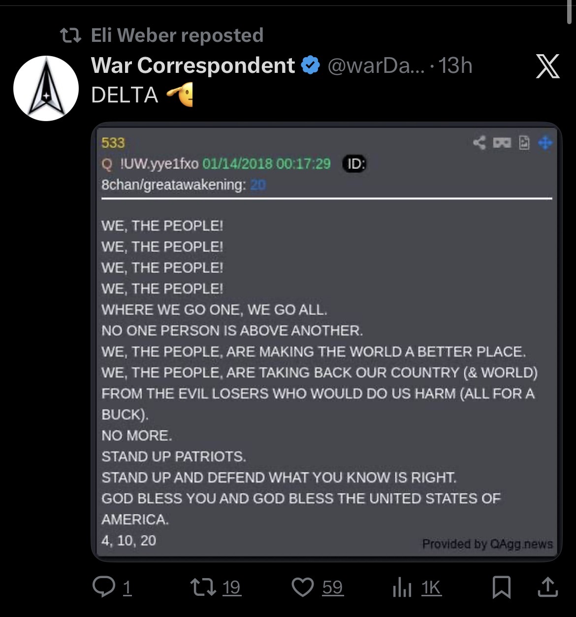 >>61650208>4 10 20I remember when q schizos thought this was 4/10/20 which was exactly 30 days after covid was declared a pandemic ("done in 30") and that babies were being freed from the underground rape tunnels and brought onto those hospital ships and that covid was just a psyop ran by the White Hats to give them cover to save them.