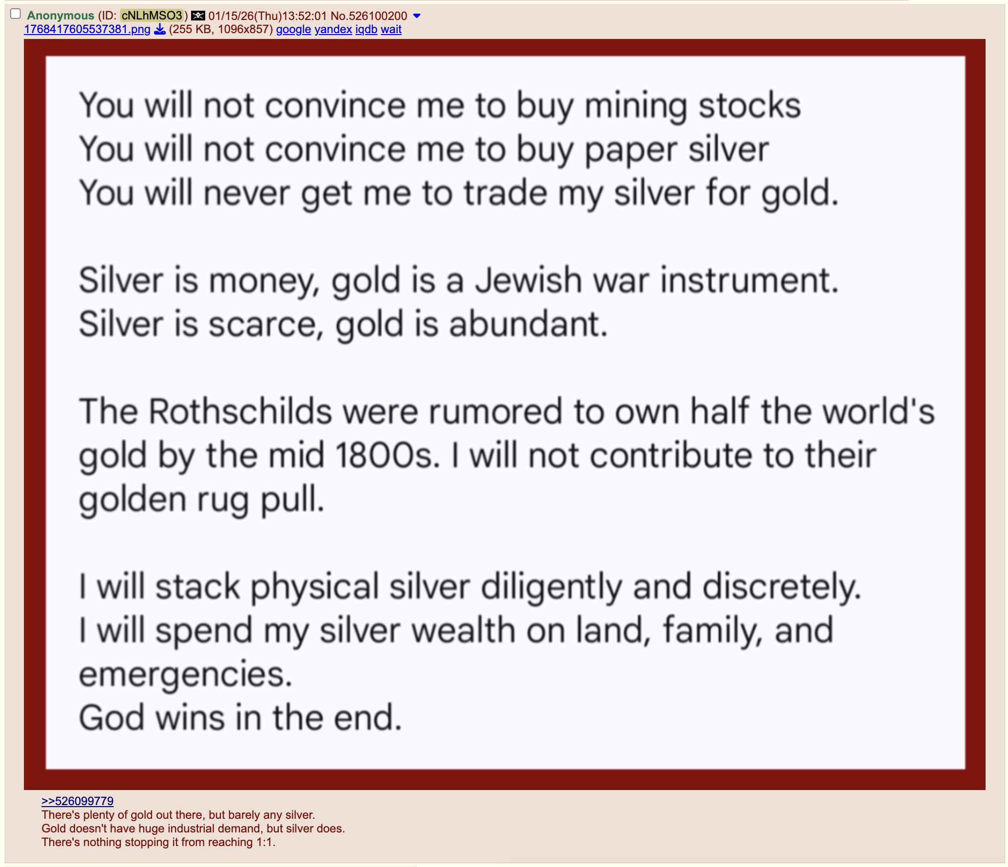 >>61650867 #>>61650907 #>>61650912 #>>61650937 #Friendly reminder this anon that keeps shitting on gold is a meme flag jew. I want all silvermax anons to think deeply about this and its implications. This isn’t to suggest to not stack silver, but please make sure you guys aren’t neglecting gold because of this jew, especially the >100:1 physical bros.Take care, I’ll be in greener pastures w /bant/bros