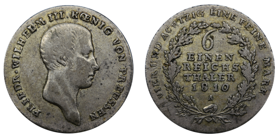 >>61651702An 1816 A 1/6 Reichsthaler from Prussia.>its more worn out than standing libertysBecause it's 100 years older than them. I think I got it out of a bag of British .500 coins.It was neat to have a coin from one of the Kings that defeated Napoleon alongside a coin commemorating Prussia's victory in the Napoleonic Wars (bottom right).