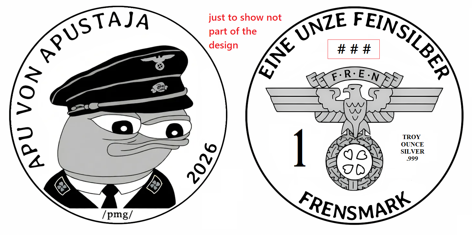 Inspired by the board and their seemingly endless quest to mint the Frensmark, I have taken it upon my self to help the poor goys uh I mean guys of /pmg/. I have totally talked to a mint and make dies and have production samples of the Frensmark, even tho I didn't take any community feedback on the design! I know way better than y'all, you don't need serial numbers on your rounds, no no no, and we definetly won't fix the German text on the back! What are you, some sort of chud? But be warned! This once in a lifetime opportunity is for serious collectors only. Please realize that I have to make a huge profit on these and not just a small one. These rounds will not be cheap. I will set up a website with details where cash or crypto can be wired. I’m sorry, but I can’t provide photographic proof that I have the rounds. I’m sure you will understand why. Once this website is live, you will have EXACTLY 24 hours to deposit money into my account. I also cannot disclose the price of these rounds at this time. I’m again sure you will understand why. So just make sure you are ready with lots of cash or crypto. You will not want to miss this opportunity. Please see the Vocaroo link below for more info.https://voca.ro/16j54TzVZXum