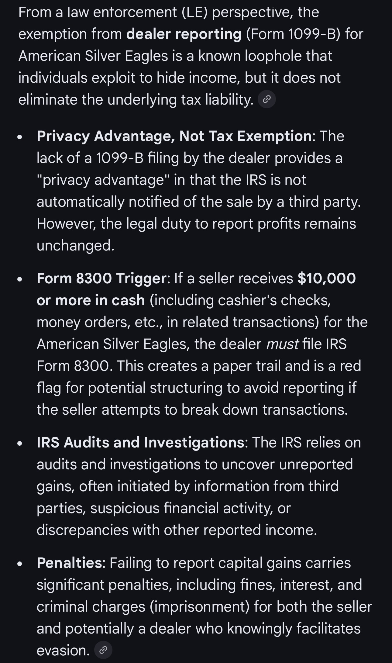 >>61656118I don’t know but I do know that selling American Silver Eagle coins does not require dealers to file a Form 1099-B but the seller is still legally (((obligated))) to report all capital gains to the IRS. I wondered why people thought eagles were dog shit. /shrug