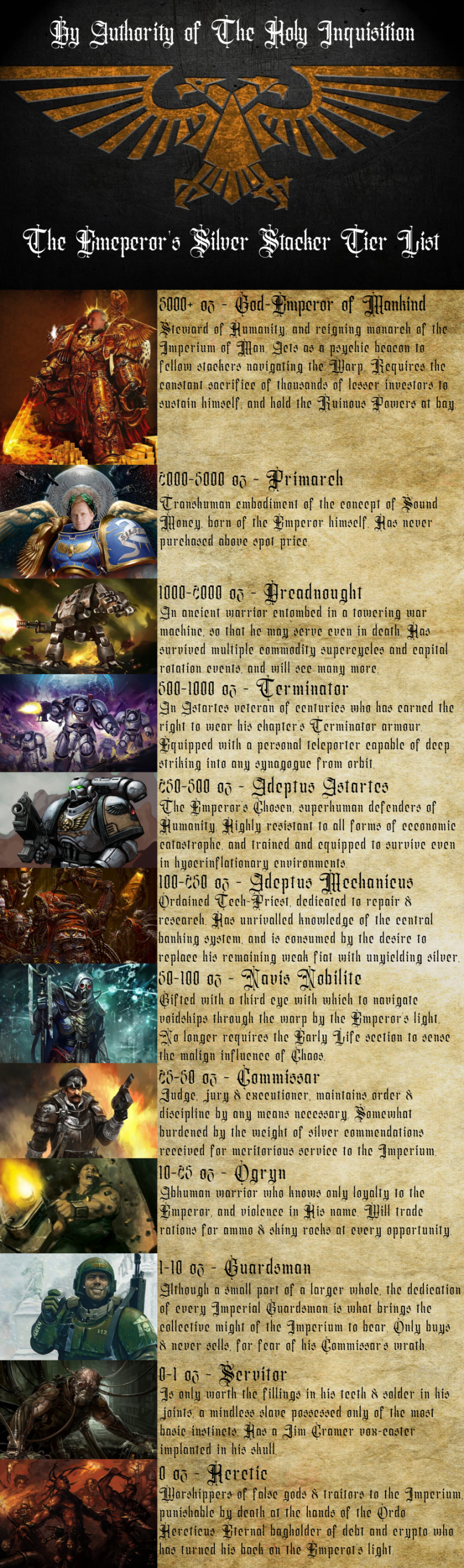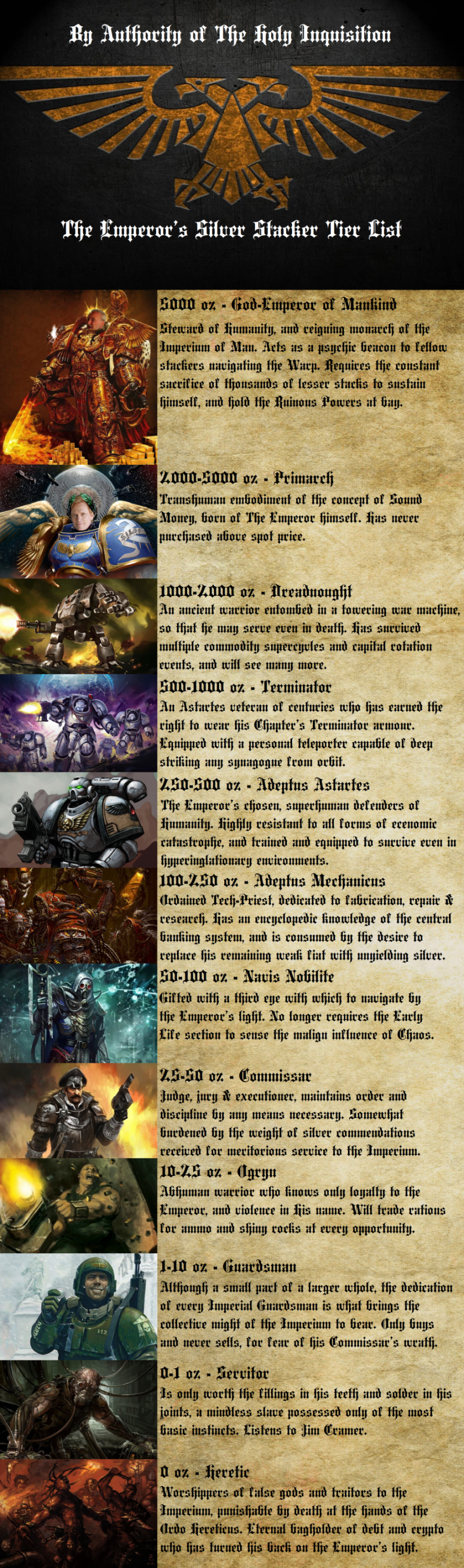 >>61657231Not 100% sold on the font, particularly don't like the "r"s, they look too much like "c". Would adeptus mechanicus outrank navigators in universe also? Feel like those two should maybe be swapped, but I guess mechanicus is more iconic and thus desirable. Other than that, great chart.