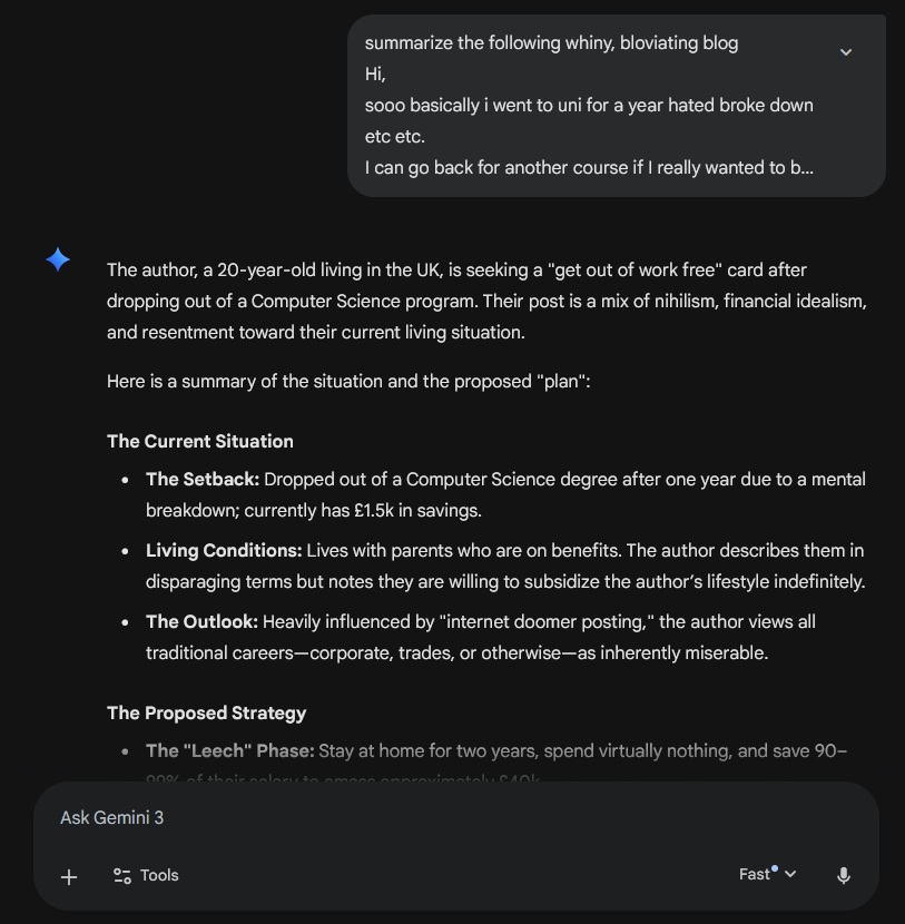 >>61658633>asking chat gpt for life adviceThanks for the promo sam altman. kys>>61658646Did you even read my post? I said I wanted to get a minimum wage job, what are you talking about? Also alot of university degrees arent even a guaranteed path into a good job anymore, and I am unsure if I would get through the mental checklist for military (self harm scars on arm when i was 13, very minor tho). nor do i really even want to join the military either.
