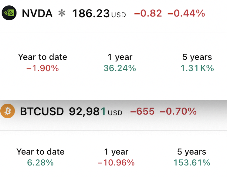 >>61668613>I did invest in NVDA too, and no, I didn't gain as muchkek you must be retarded, NVIDIA mogged Bitcoin in terms of gains over the past 5 years.Bitcoin is now an ultra boomer asset that gets outperformed by pretty much everything