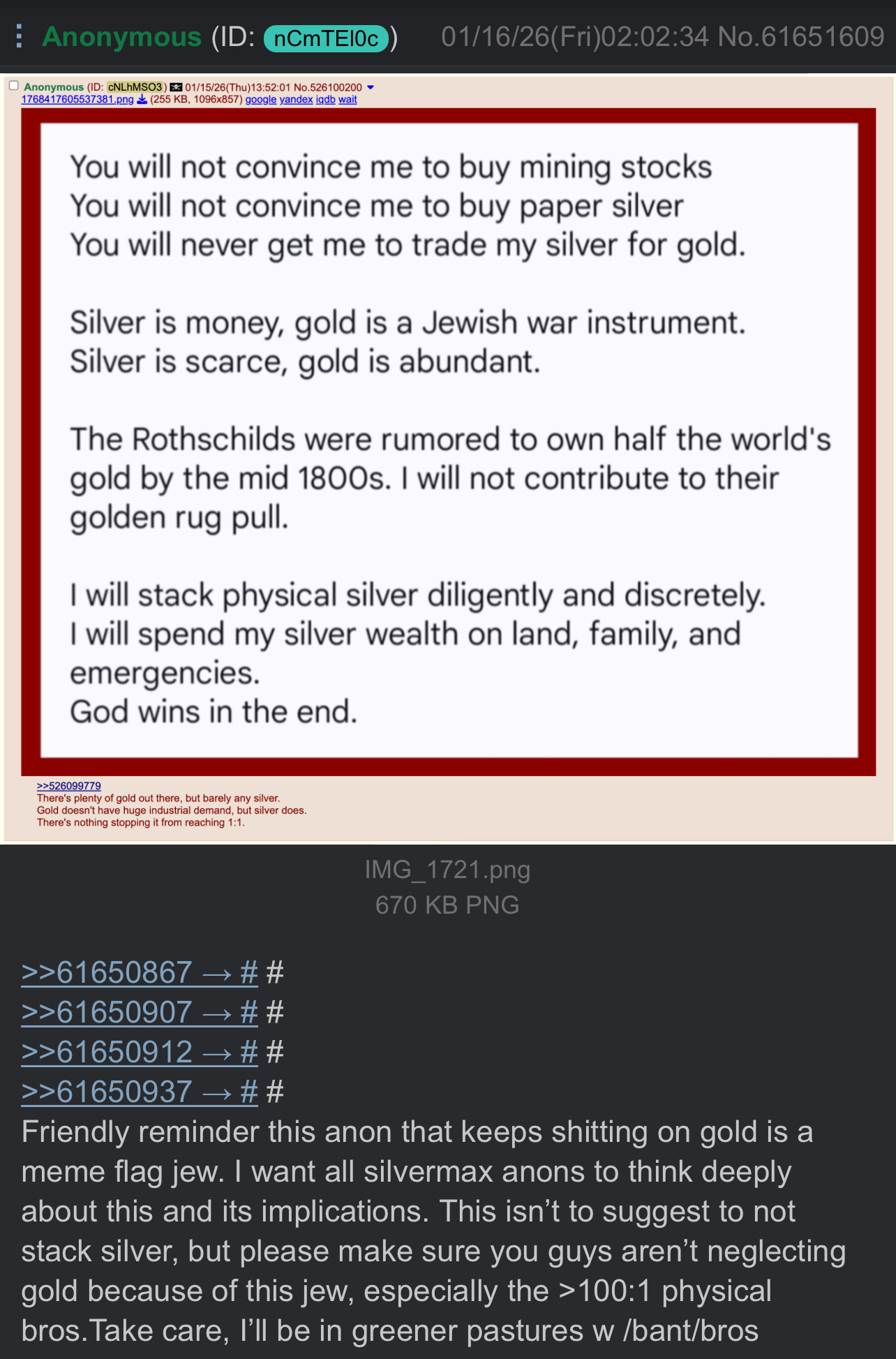 >>61670430The Rothscilds own most of the gold and will do anything in their almost infinite power to increase its value. They will force the world onto a gold standard again which will drive the price of gold into the stratosphere. Stacking gold is the road to riches! Ride the Rothschild coattails as they make gold king of the world again. Get on the Rothschild gold train by buying as much gold as you can. Also, every ounce of gold you buy is one less that they can use to fund war.So stacking gold is win/win. Get rich and promote world peace!