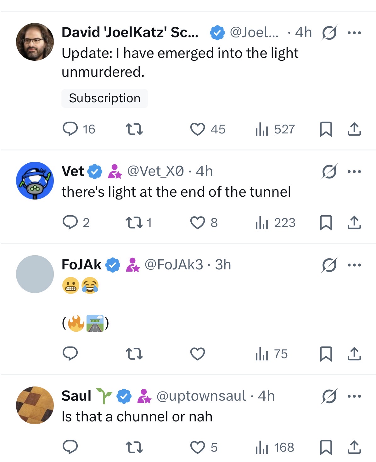 >>61679150I was going on a spree couple of weeks ago calling out every grifter posting screenshots of all their wrong calls asking them why they ignore those and they literally mass blocked me, now I gotta look up these guys manually because they dont show up in my feed anymore until I find the energy to make a new twitter account but i'm always too lazy just how I keep forgetting I need to update my car navigation which I havent done in fucking years so I keep running into streets that dont exist kek.Guess I didn't miss a single thing, they are literally just repeating the same old bullshit that never comes true.There is no reason to follow them anyway. Just look them up once a month and see all their wrong calls lol. But I wouldn't give them the time of day anymore