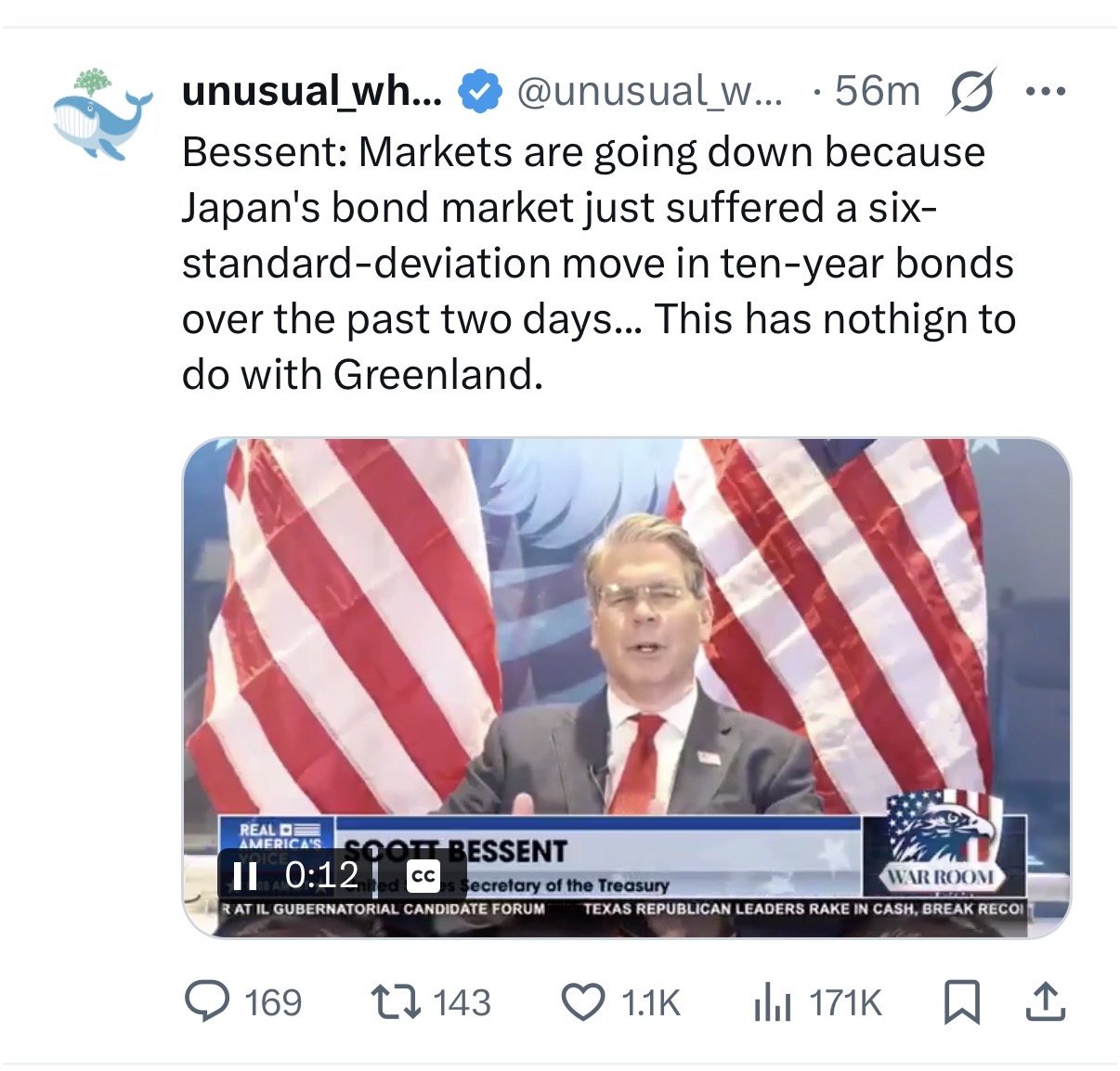 >>61677177>>61677250It begins:https://x.com/KobeissiLetter/status/2013609922974421502?s=20>BREAKING: Danish pension fund Akademiker Pension announces they will sell all US Treasuries by month-end, citing "rising credit risk" under President Trump.>The fund's CIO says US finances are no longer "sustainable," due to weak fiscal discipline, a softer Dollar, and Trump’s push for Greenland.