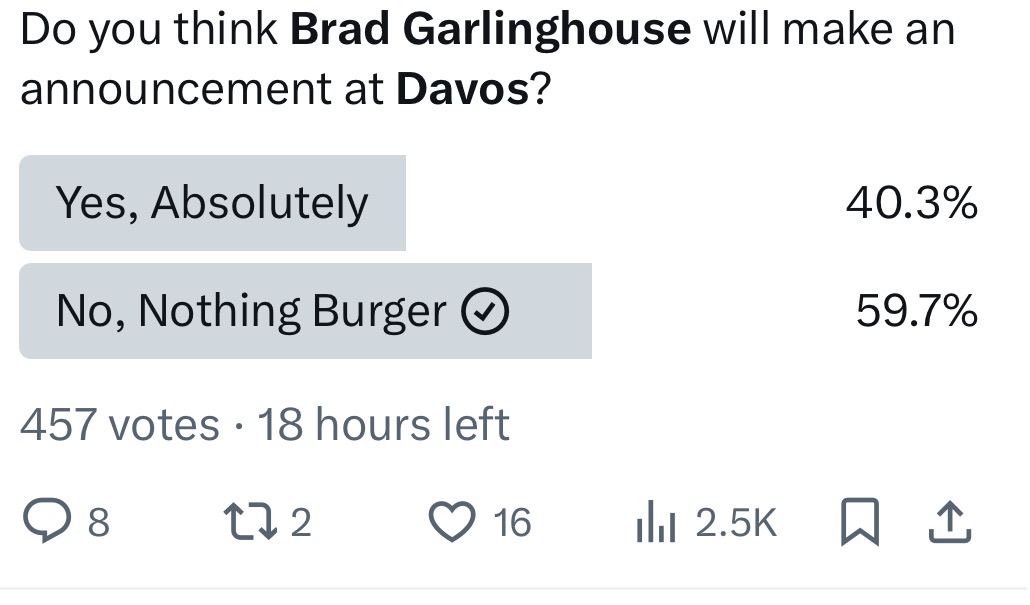 Brad is speaking at 10:30 in Davos, which is 3:30 Texas time, here’s a link to the live streamhttps://m.youtube.com/@USA_House