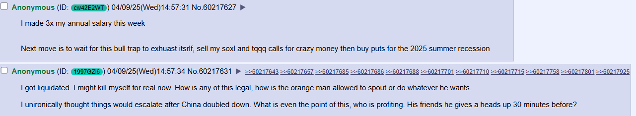 >>61674947>trust me broI spend money like a mad person and I've never seen a tariff charge on my bills even though I order things that come to me directly from tariff hit countries. It's pretty obvious that merchants have just decided to suck up the charge. At least I can say this for consumer products, maybe it's different for things like raw material.