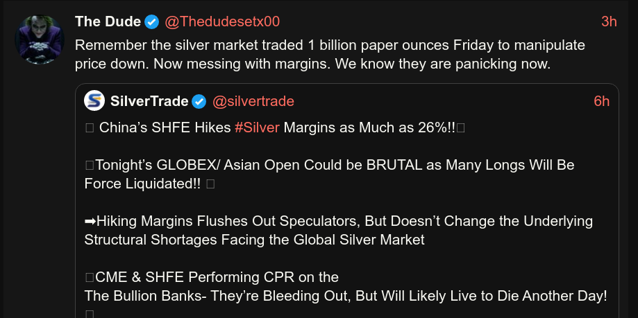 >>61679361Here's how it's supposed to work in the futures market. Let's say you have a silver mine. The mine produces 100k ounces of silver equivalent ore per month. You need a a million dollars for payroll, diesel fuel, etc. You sell 20k oz of silver for future delivery, say in 3 months at $50 ($1 million).This is fine, the silver doesn't exist, but will be produced to cover the sale. Bullion banks are allowed to "naked short" which means they can create paper silver contracts out of thin air and sell them as if they were real.Most shorting done by ordinary investors requires that the inverstor "lease" the silver from another investor. There is a small fee for leasing the share, so it is not a "naked" short, there is actual physical silver covering that short sale.Bullion banks have created hundreds of millions of naked shorts that they keep rolling over. The problem is the vaults are running out of physical silver to sell. Sort of like when the bank runs out of physical cash to give to the depositors.This is what will crash the COMEX and the LBMA. They can "force cash settle". Ie, if you wanted silver, they write you a check for the current closing price and according to their agreement, you have no cause for action.Even if the Friday forced cash settlement is $50 lower than the Monday morning open price. You thought you had silver, now you don't even have enough money to buy the silver you thought you already owned.A market with no goods to sell doesn't exist.
