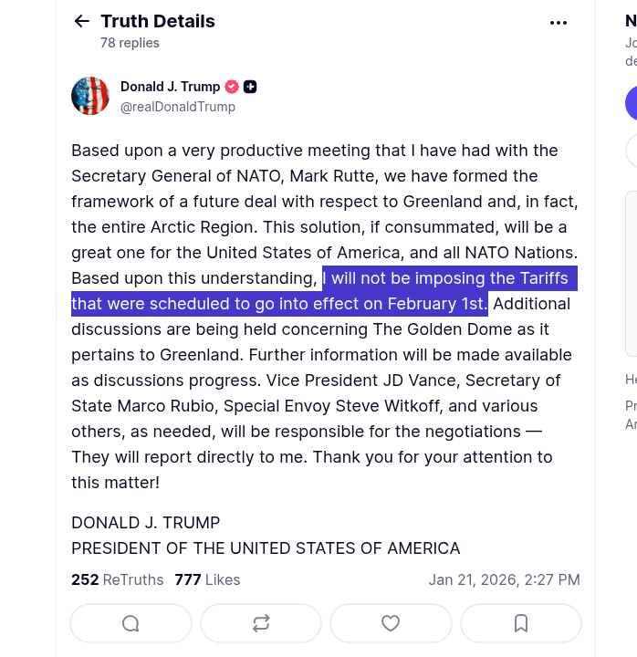 I don't think the Greenland saga is over. Trump met with the NATO secretary aka a useless asskisser, not the actual euro leaders. Now the euros could back down, but the danes have already came out and said they have no idea what the fuck Trump is talking about with this supposed deal and they've heard nothing of it. Euros might reassert that Greenland is not for sale and we're back right where we started.