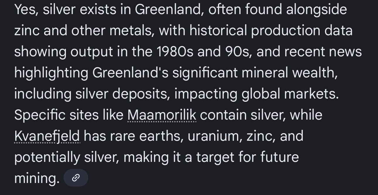 >>61684786We have already priced in non existent silver and other commodities and as such are now experiencing shortages, exchanges have been held together with only leases in an international shell game. Refineries are focusing only on contract deliverable slowing the resale and recycling ever more as atleast some of the IOUs have to be produced. Even still one could swell the markets with everything .999 for sale right now, India can't be the one to do it this time because it's 80% all jewelry and see above for refineries, but you could collect all of the other silver theoretically and push the price down again with headlines of a glut in Greenland same as every "great" new mining opportunity in Africa of the last 5 years. And if this were to happen what happens to production? We still run yoy production deficits, china buys for cheap because any misalignment greater than their vat is free money, no new mines including your Greenland one get built maybe just explored but nothing ventured or gained and then we arrive at exactly the same place with a worse problem because we lived off of imaginary silver even longer instead of investing in the underlying infrastructure to actually produce it. Pointing at some shit in the ground you don't own with some lazy natives on top does not a single commodity make, it doesn't even make a mine, it's fucking nothing. Stop getting your ideas directly from AI, AI doesn't mine or produce commodities either it just consumes them.