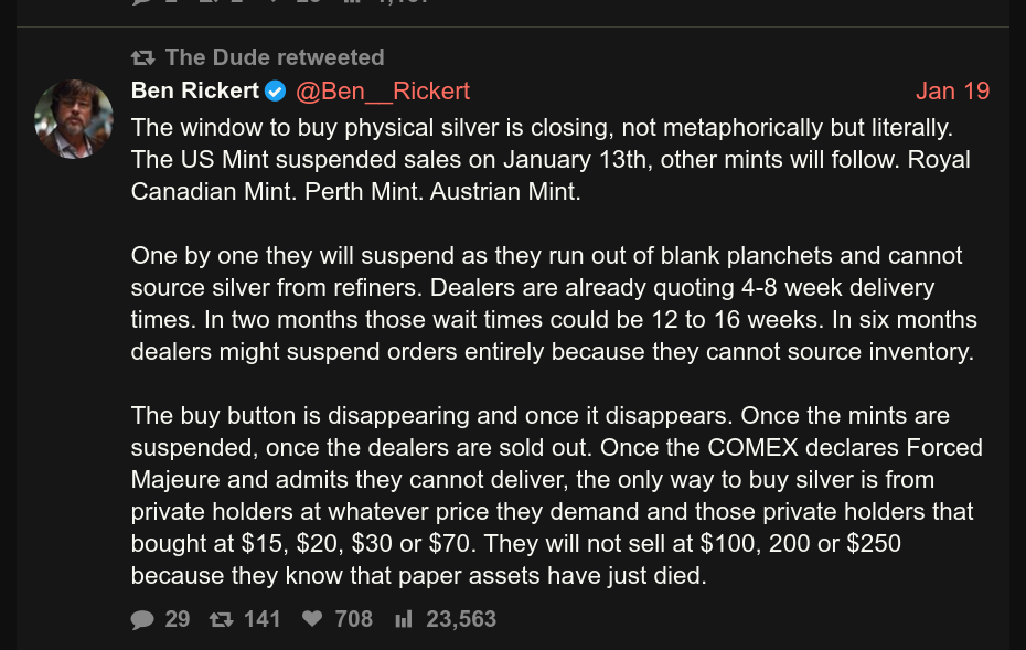 Between industrial and wealthy boomers trying to avoid losing their life savings to inflation, silver chads will be eating, drinking and enjoying their mercury dimes. At least the single silver chads will be enjoying life.