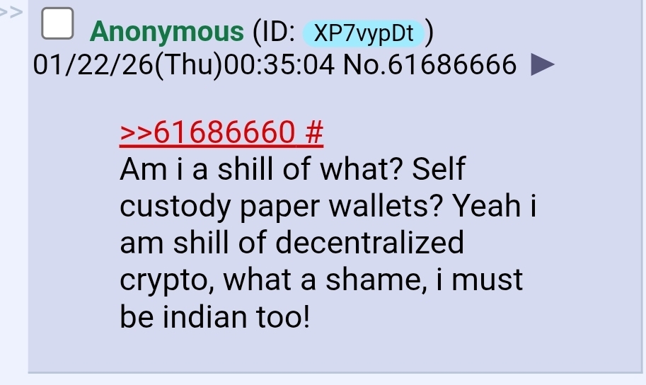 >>61686660Am i a shill of what? Self custody paper wallets? Yeah i am shill of decentralized crypto, what a shame, i must be indian too!