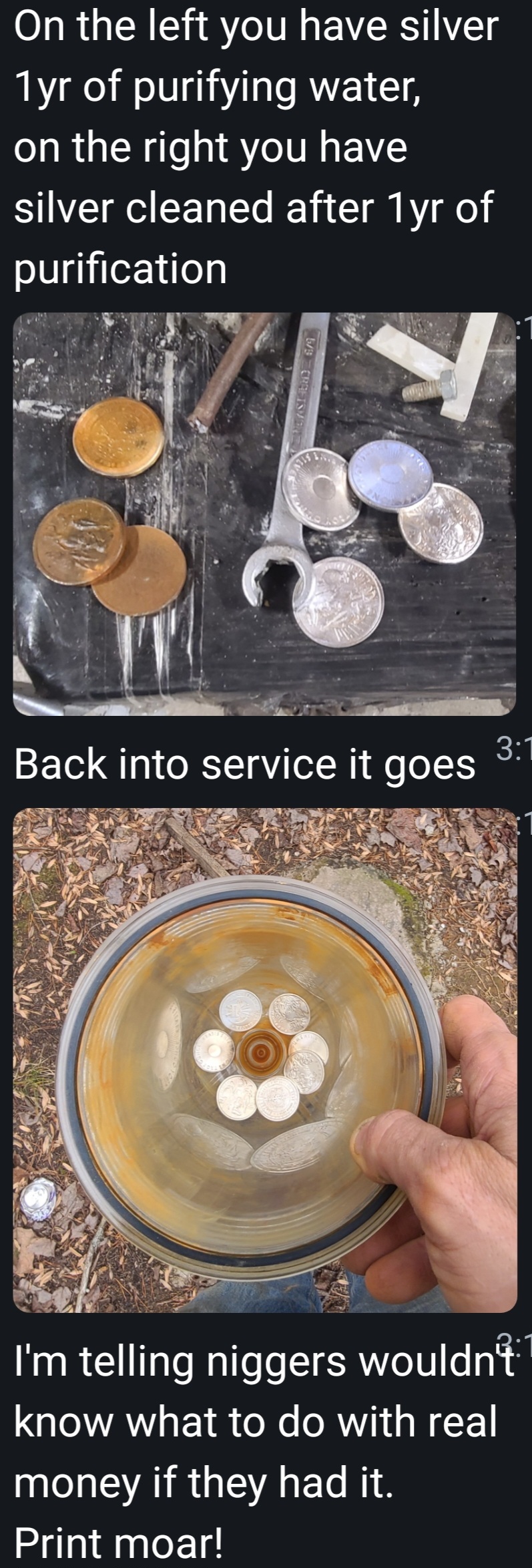 >>61701925>The ESL caption is confusing me. It's okay if you're ESL fren. Let me explain in a long diatribe of words to portray the point to you on a silver platter, even A.I. can translate into your native terrestrial tongue:In the image, there are some dirty silver rounds that have been encapsulated within a well water system to disinfect and help clense the stagnant and putrid H2O to make it fit to adequately serve a lifeform through consumption. Being as how lower lifeforms subsist upon upper lifeforms for hosting and providing nutritional support, they propagate in water to find entrance to those upper lifeforms hosts. Silver being antimicrobial, antibacterial, antiviral, and anti-parasitic when placed in the gap of the stagnation and consumption kills these little pests before they can gain entry. Thereby reducing the upper lifeforms' ingestion on natural enemies to its hosting and allowing it to thrive. So, to specifically address if it (the silver) was used or left, is a complete misunderstanding it is referring to the silver on the left in the picture was used and left to, moreover the service of the silver was to eliminate the lower lifeforms that parasite upon the upper ones. However I, one of those upper lifeforms had to service the silver as illustrated by the silver on the right of the picture having to work to clean it off before reintroduction into to stream of service it was preforming. This is why it's actually performing a function in service to an upper lifeform because the upper lifeform isn't willfully ignorant of its capacity or usefulness to serve. And also why niggers (willfully ignorant people) think currencies are money. Hopefully the A.I. can accurately transliterate this into whatever terrestrial speak is your best fit. May God bless you and keep you and remember, you don't have to add anything to the well to poison it if you remove the silver it accomplishes the same results.