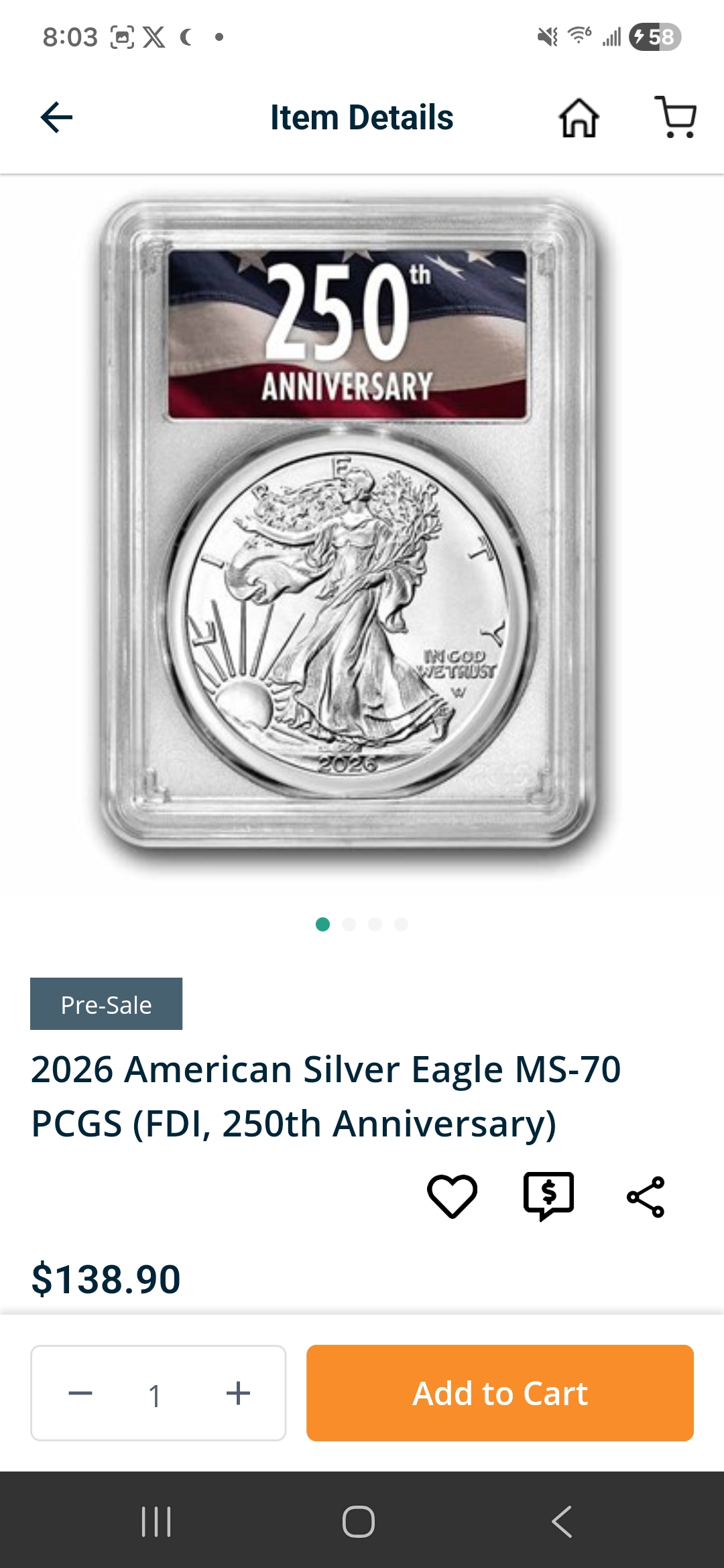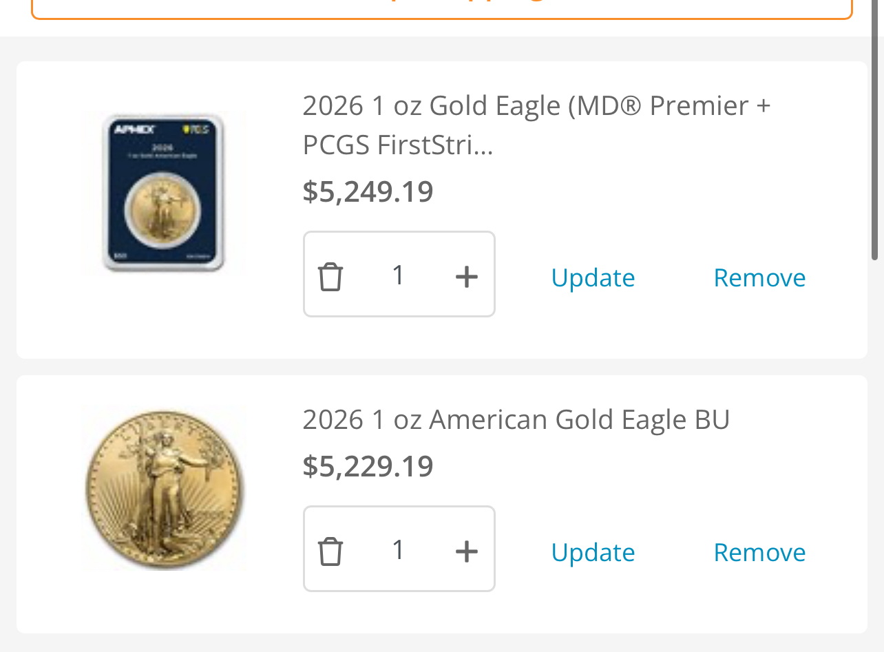 I purchased an American Gold Eagle ages ago and slowly began to hate it. I think I'll call my dealer on monday to cash it out and buy more silver.