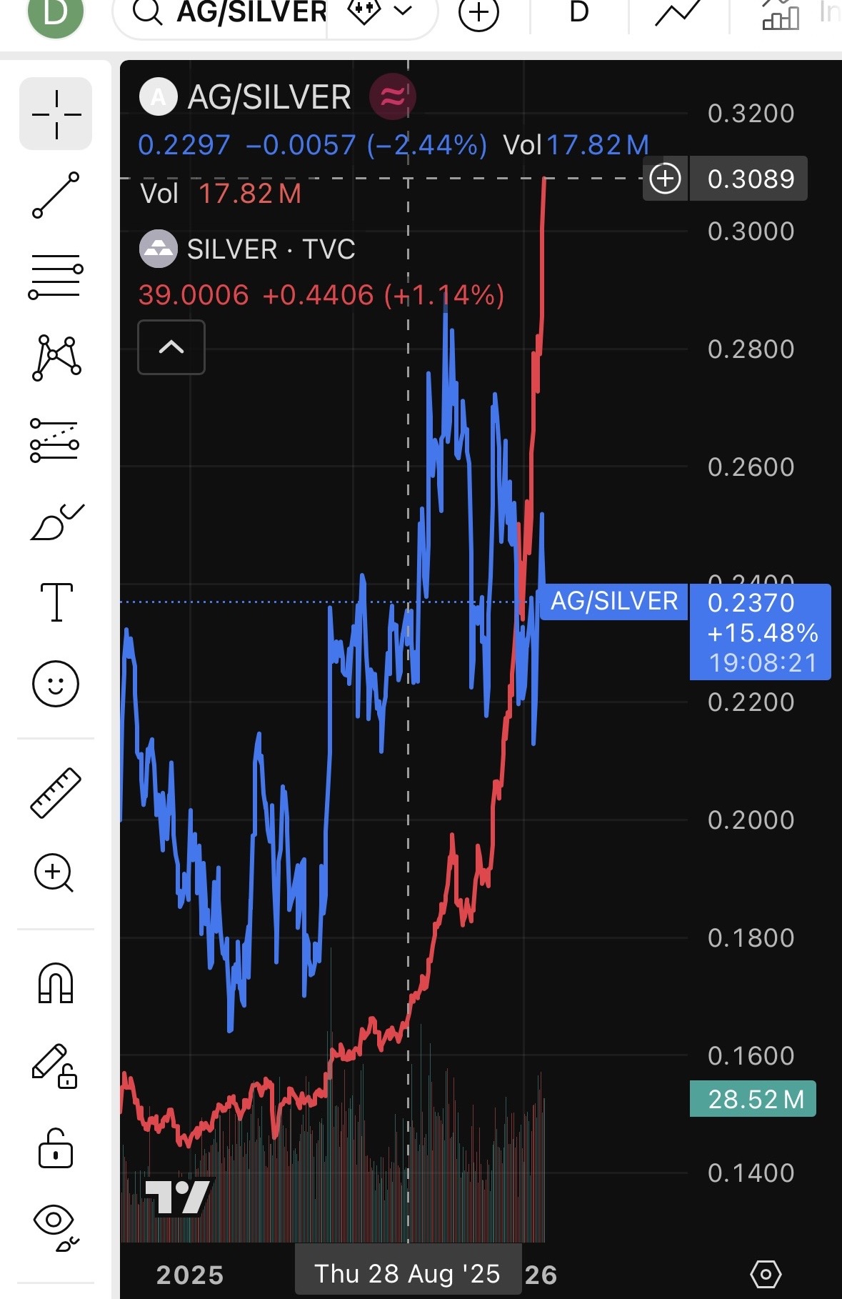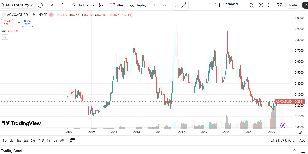 >>61709500He’s buying the miners. SIL and SILJ just mean the miners. Now take a look at this. For anyone feeling FOMO on the metals. Look at this graph. This is first Majestic priced in silver itself (AG/SILVER). Overlayed with the price of silver. It’s actually been falling in price for months! (Gold is opposite look at Hecla). Which means the stocks are massively under priced in silver still because the market didn’t believe it and it is blinded by the AI bubble. So if you are looking for an entry. It’s literally Ona fucking plate. What other stocks are deflating while their margins/product is exploding like this? That’s why RickRule sold hundreds of millions in silver. He seems billions more to be made in the underpriced companies digging it up for 17 and selling it soon for 140. And maybe more. Margins NVIDIA have never had. Not could they ever dream of. You either see it or you don’t.