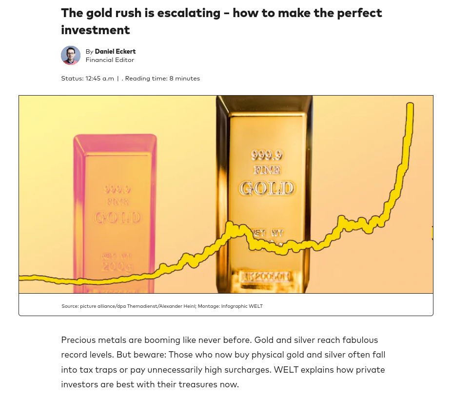 German MSM telling their readers to avoid buying physical. They distract from silver (honorable mention) by focusing on gold. And experts explain why hedging with 10% paper gold in your portfolio is wise.