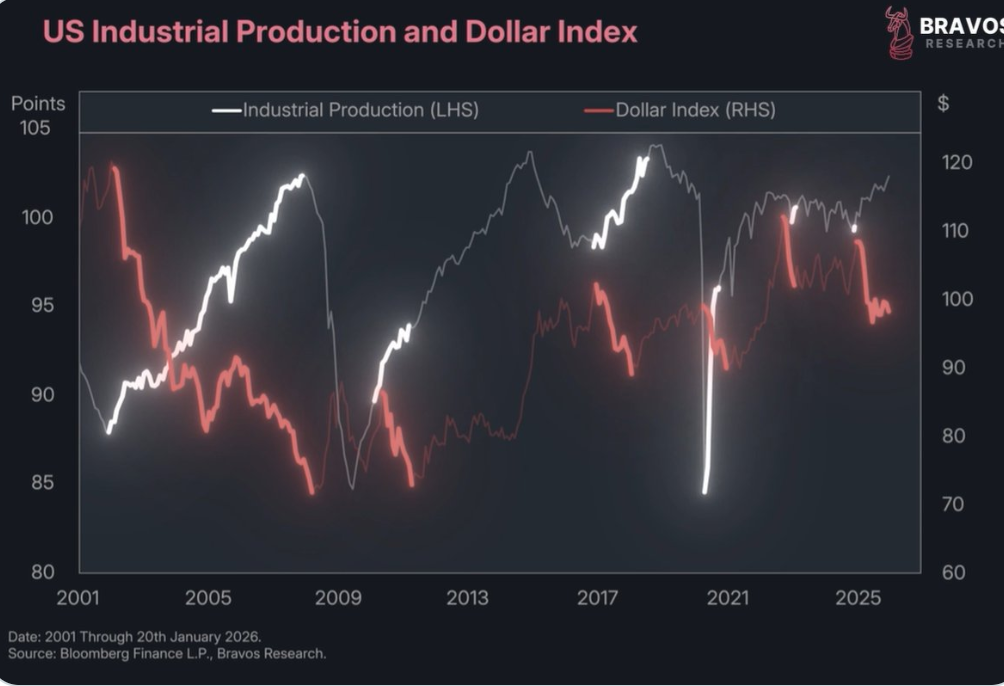 When we overlay the US dollar index, we see that periods of dollar weakness coincides with stronger industrial production.