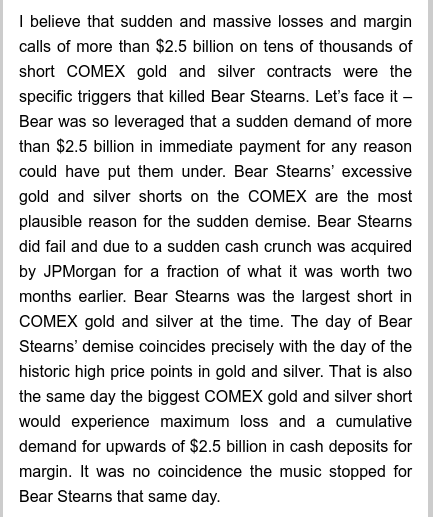 >>61718731One day for no particular reason whatsoever, something can happen.I have not seen anyone in these threads speculate on the specific reason why 1.5 billion ounces of silver were sold short today. My theory is that there are billions of ounces of shorts outstanding, and the price going to $120/oz would put some TBTF banks underwater, with some of their shorts going back to possibly $40, so at $80/oz of loss @ 5 billion ounces is $400 billion. Remember, the original 2008 bailout was only a total of $900 billion (which seemed like a lot in those days).Also, the 2008 crash was precipitated by Bear Stearns being unable to cover their losses of SILVER SHORT positions.https://silverseek.com/article/what-really-happened-bear-stearns