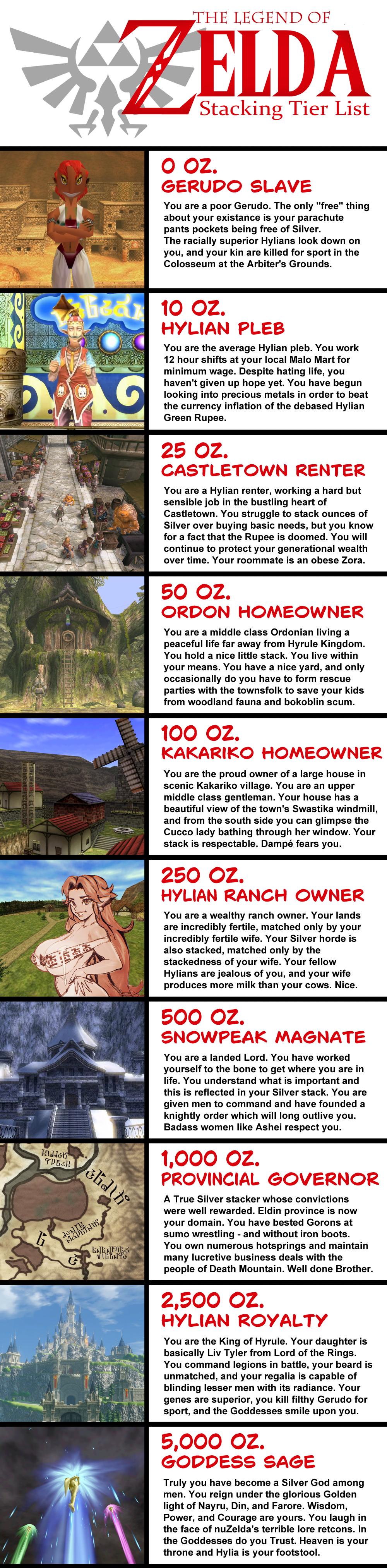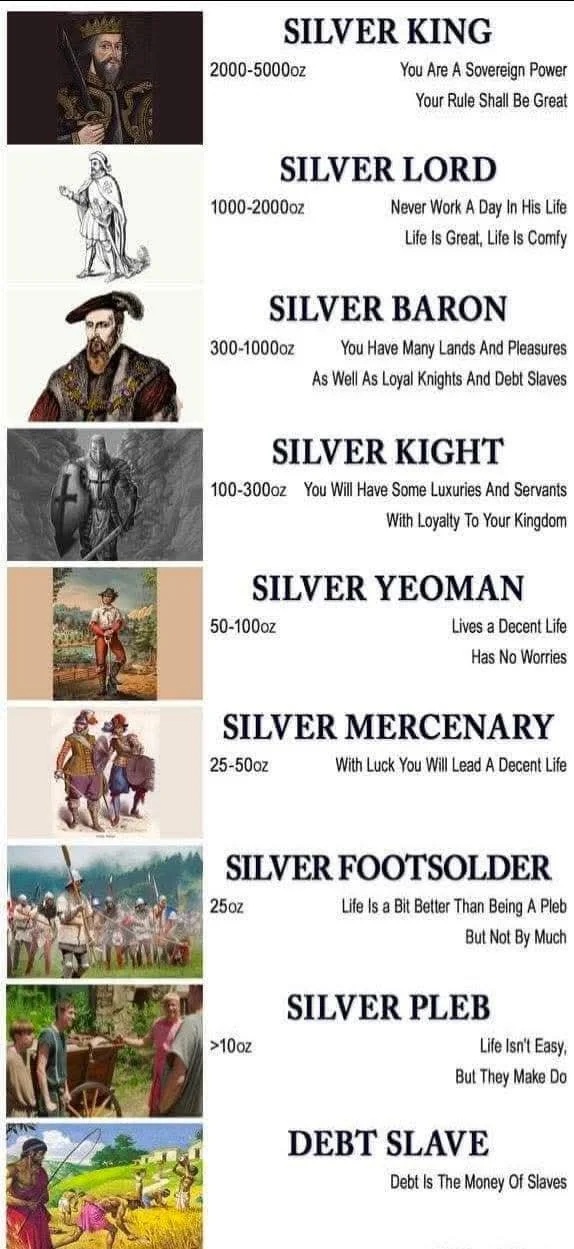 >>61720049>I get this part about being in the top percentilesBut it isn't. It should be read as, "If all the available silver were evenly distributed amongst one percent of the world's population, each would get 36 ounces of silver..." It's not really a ranking of where you'd stand if you had that much.>but isnt "making it" subjective.Absolutely, yes. So it's a silly meme thing, but accounting for personal factors, it's also a meaningful goal.