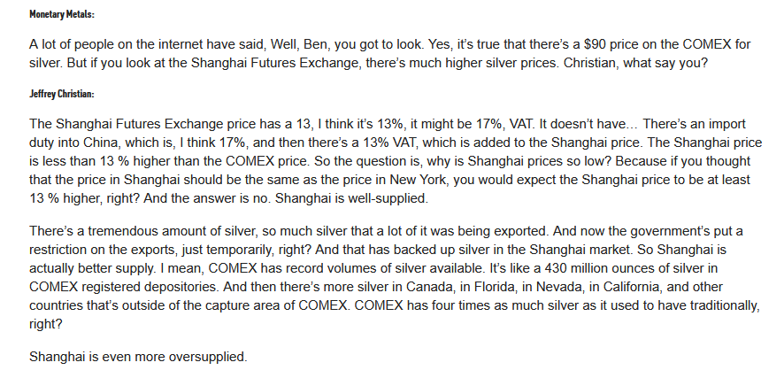 read a good interview on zh, it's long but worth a read:https://www.zerohedge.com/news/2026-01-26/gold-and-silver-hit-new-highs-heres-what-eventually-stops-rallyThey touch on a lot of topics, one standout for me was when they talked about the price difference in china, the expert said the chinese price we see has at $17 vat tax built into it, and people in china are actually buying silver cheaper than we are right now.